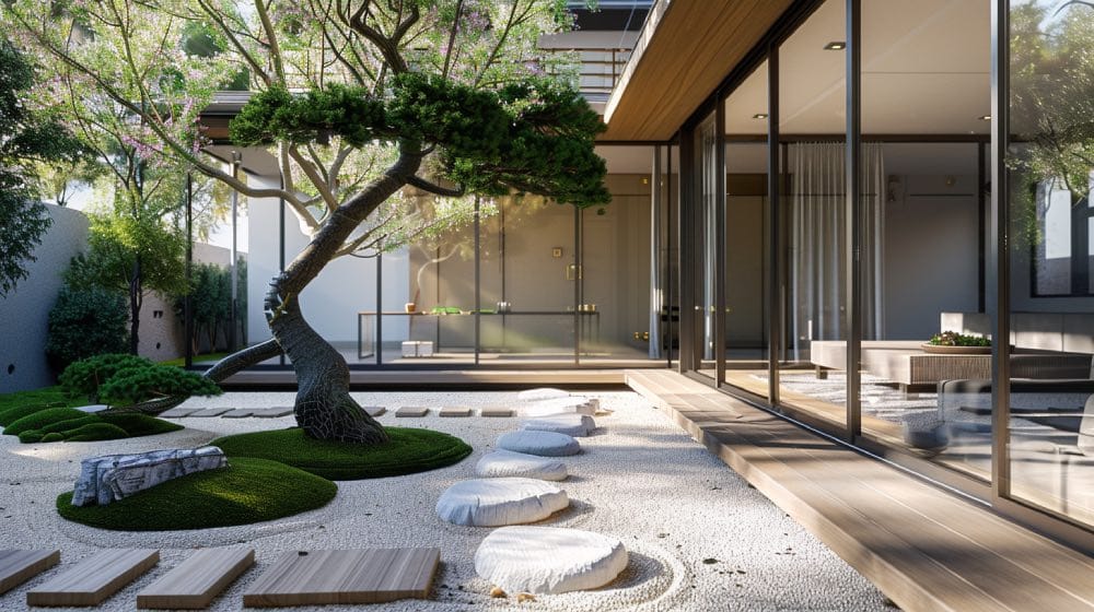 Zen-Gärten dienen der Meditation und dem Erlangen von innerem Frieden. Sie bestehen in der Regel aus geharktem Sand oder Kies mit strategisch platzierten Steinen als Hauptelementen und nur einer begrenzten Anzahl von Pflanzen. Der Schwerpunkt liegt hier auf der Aufmerksamkeit für sich selbst, nicht für die Umgebung. Zen-Gärten zeichnen sich auch durch Einfachheit, Minimalismus, klare Linien und funktionale Möbel aus, wodurch Mindfulness gefördert wird.