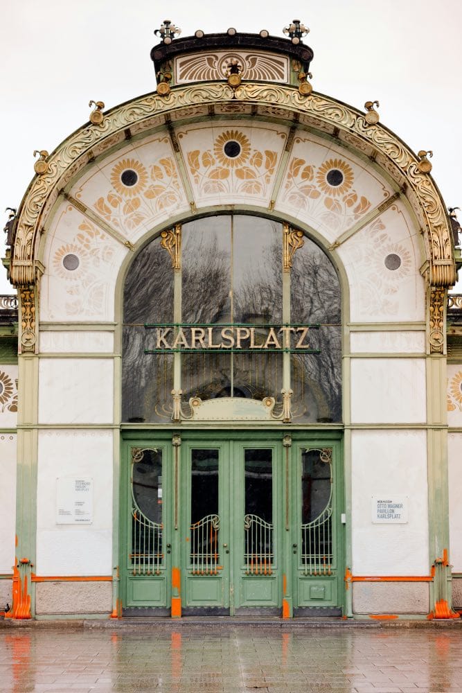 Am Karlsplatz in Wien schuf Otto Wagner mit den beiden Stadtbahn-Pavillons (1898-1899) Meisterwerke des funktionalen Jugendstils. Die eleganten Stahlkonstruktionen mit Marmor- und Goldverzierungen vereinen technische Innovation mit künstlerischem Anspruch.
