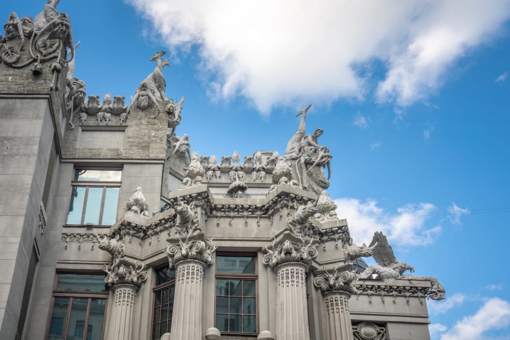 Jugendstil-Tür in Riga und Jugendstil-Gebäude in Kiew | Kristaps Grundsteins/Unsplash und Diego Grandi/Shutterstock