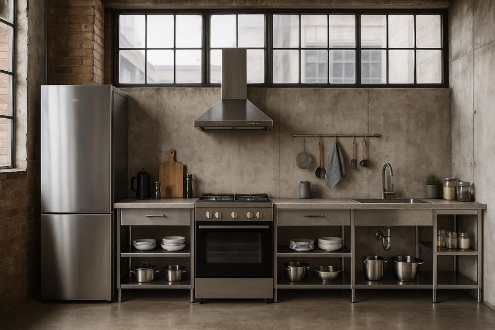 Für alle, die es etwas robuster mögen: Edelstahl-Module in Kombination mit Betonoptik-Arbeitsplatten sorgen für industriellen Charme. Besonders in offenen Wohnbereichen oder Lofts kommen solche Kombinationen perfekt zur Geltung.