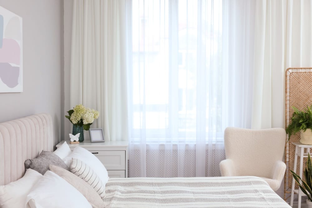 Leichte Stoffe: Vorhänge, Kissenbezüge und Decken in hellen Farben und leichten Materialien wie Leinen oder Baumwolle lassen Räume luftiger wirken.