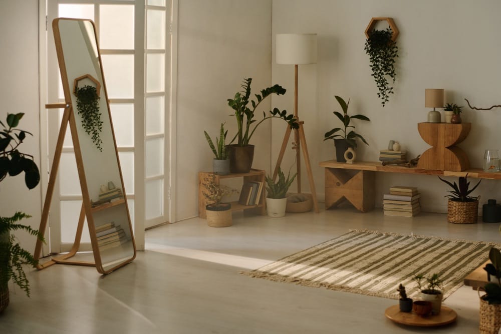 Comme ce style met l'accent sur une atmosphère calme et harmonieuse, vous pouvez ajouter de la chaleur en utilisant des tapis en fibres naturelles, des meubles en bois clair et des paniers tressés. Faire entrer la nature dans la maison est également un excellent moyen d'ajouter de la texture, de la couleur et de l'harmonie. Les plantes en pot et la verdure sont un excellent moyen de créer une atmosphère relaxante. Elles sont également des purificateurs naturels pour votre maison.