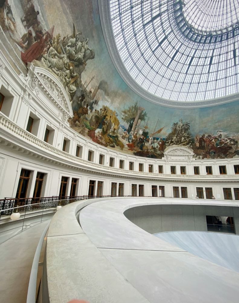 Son intervention la plus marquante ? Un cylindre en béton monumental, de 30 mètres de diamètre et 9 mètres de haut, qui trône sous la spectaculaire rotonde du bâtiment. Cette structure minimaliste crée un dialogue subtil entre passé et présent, encadrant l’espace d’exposition principal tout en mettant en valeur l’architecture d’origine. À l’intérieur, l’auditorium en sous-sol et les vastes galeries offrent une scénographie immersive, où l’art et l’architecture se répondent avec une élégance sobre et contemporaine.