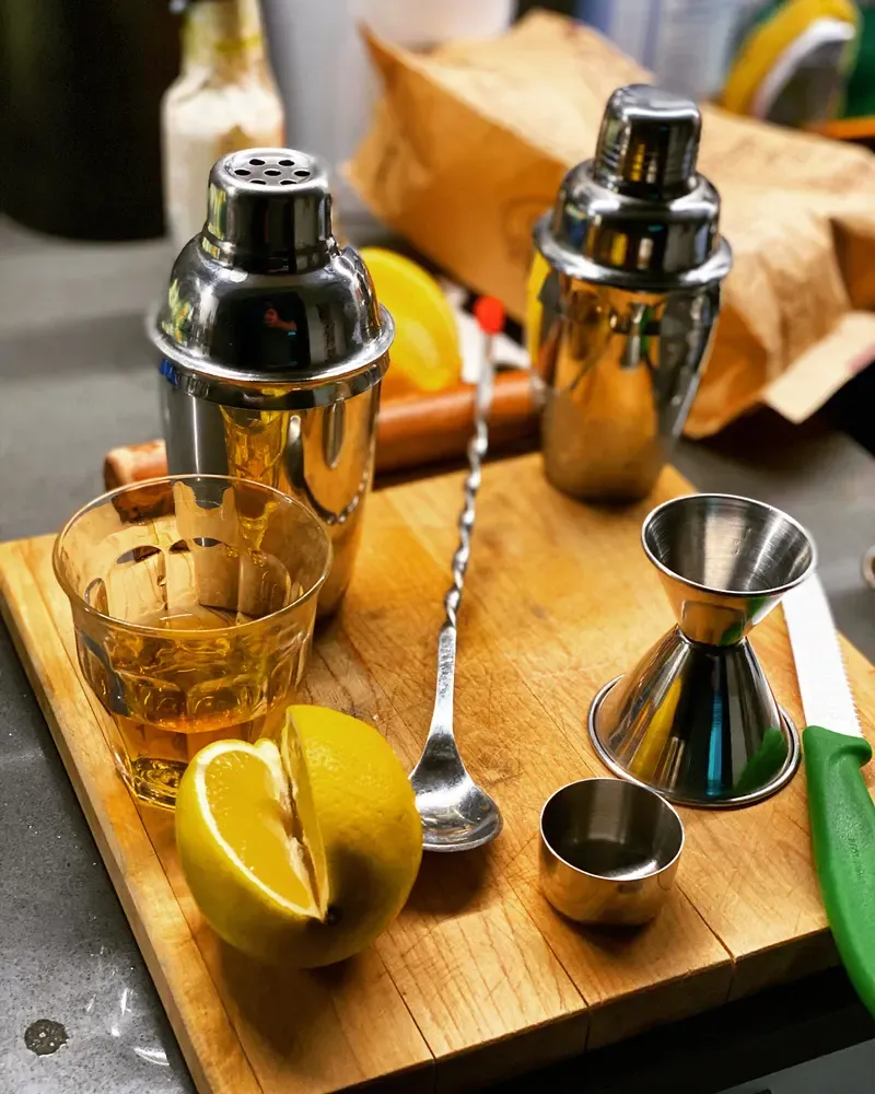 Begin with a selection of glassware, including cocktail glasses and tumblers. Include a cocktail shaker, a jigger, and a bar spoon for mixing drinks.