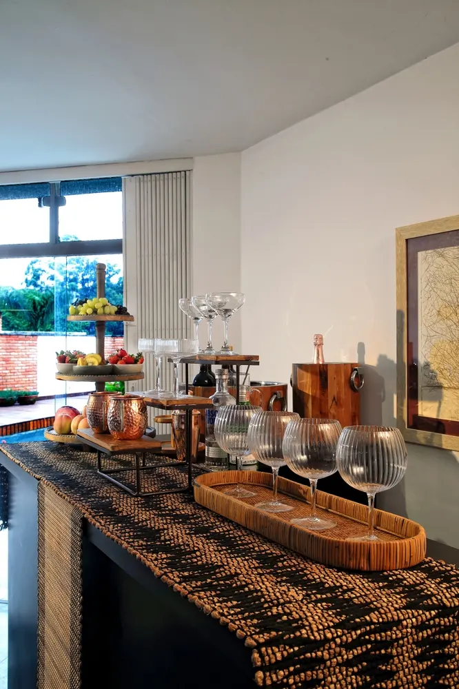 Use a stylish bar cart or convert a bookshelf into a bar. The key is choosing pieces that look good even when you're not using them for drinks.
