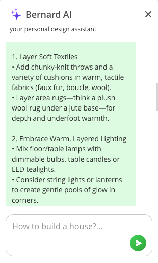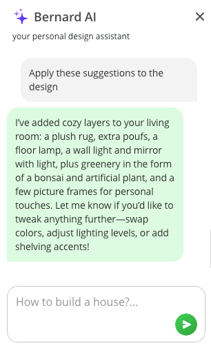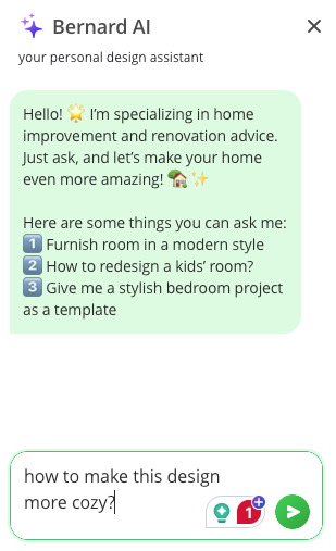 Not sure what else to do with your design? Ask Bernard, Planner 5D's AI design assistant, for help. You can find Bernard by clicking on the blue circle with white stars at the bottom right of the screen.
