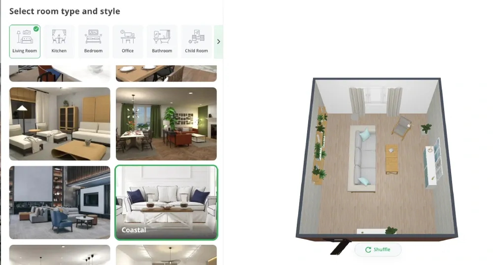 Choose the function of your room from the options provided. Then, select the design style and wait for the magic to happen. Use the "shuffle" option to switch the layout of the room till you find the one you like. Then hit "complete."
