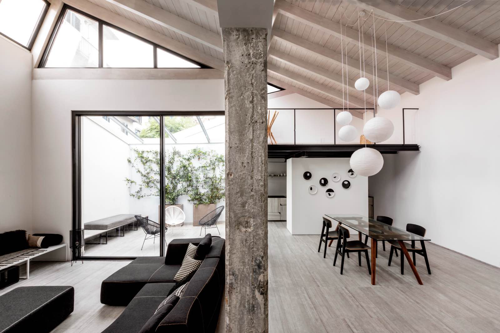 The living room and dining room are merged in a spacious central area on the lower floor, with the kitchen on one side and the main bathroom and a studio on the other. In addition, Marè manages to section off a part of the original interior and turn it into a small patio with huge windows opening to it.