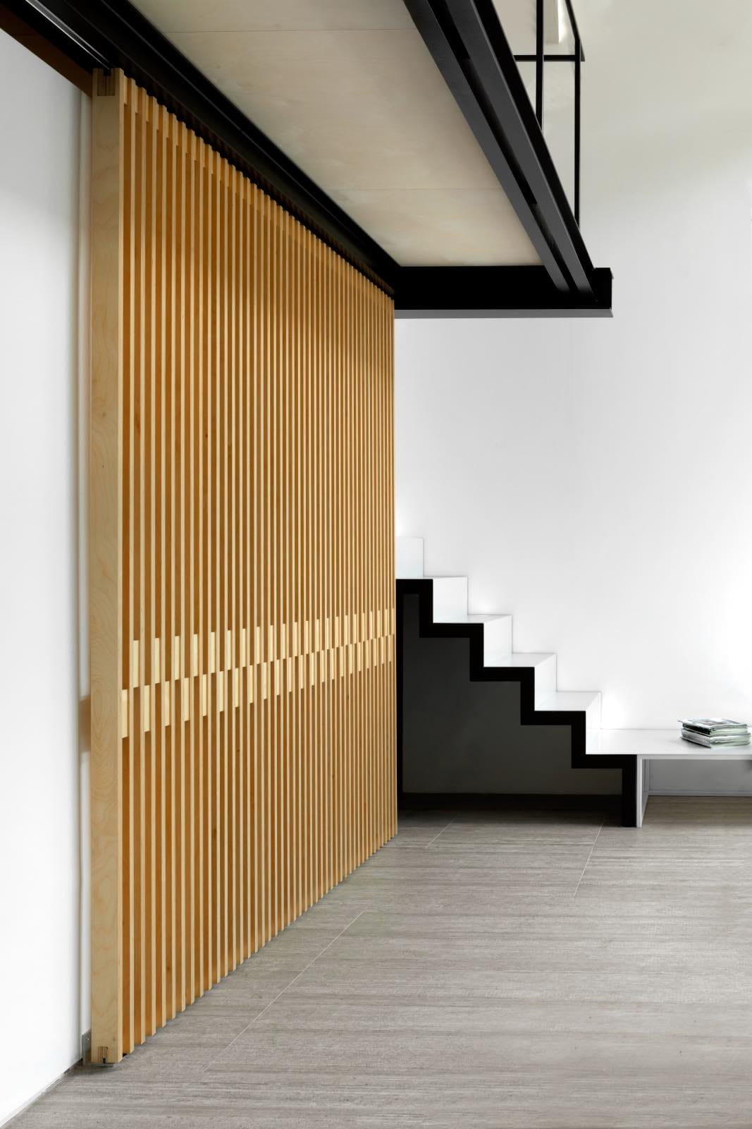 Certainly, the use of black metalwork stands out in the design of these interiors. Whether for the lofts, stairs, window frames, or railings, black stands out against the white walls and bleached wood ceilings. Also, the birch wood of a large sliding door—functioning as a sort of divider—stands out against the light tones of the architecture, providing warmth and interest to the interiors.