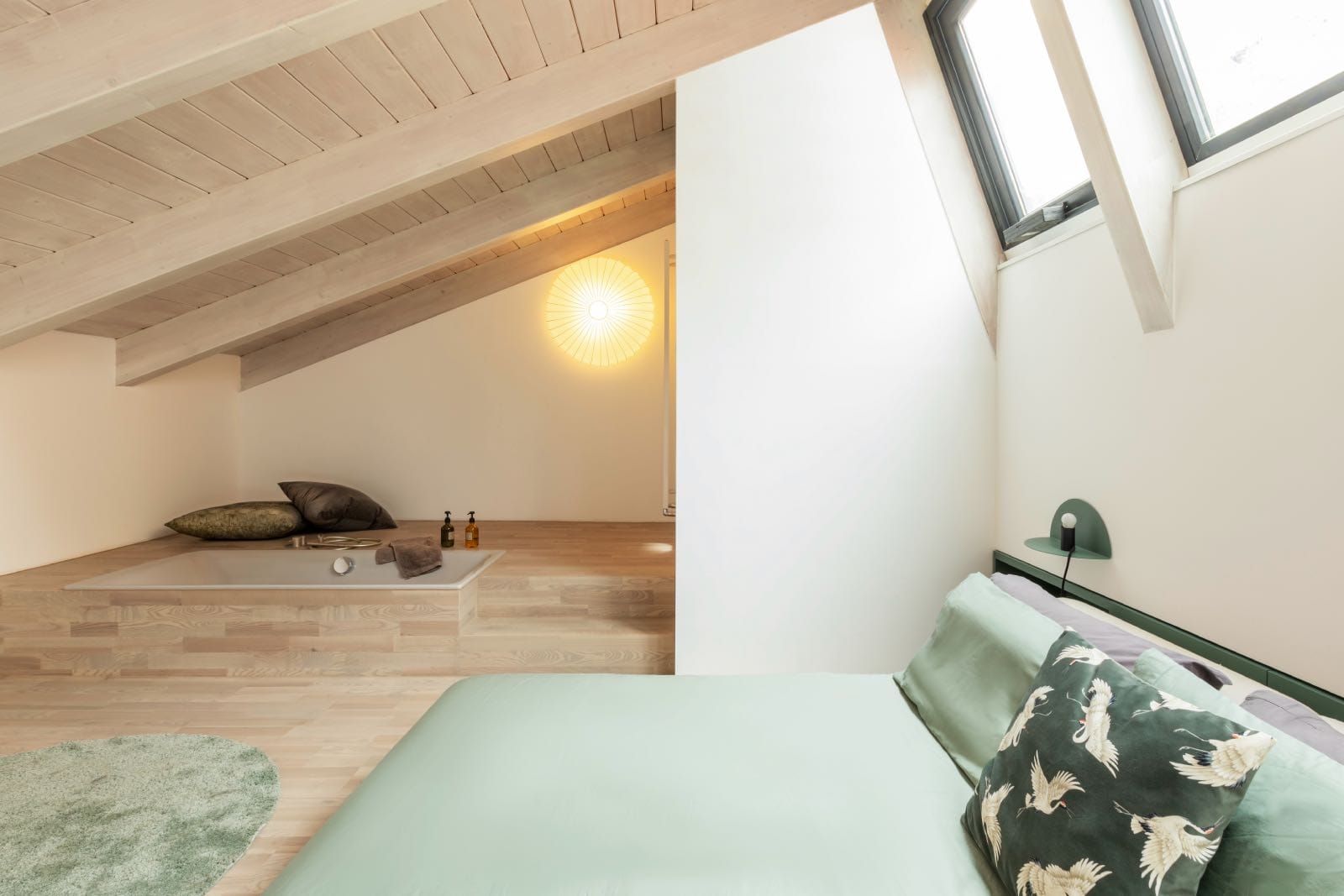 Taking advantage of the ceiling height, Paola Marè decided to distribute the different areas of the apartment across several lofts. Thus, a primary bedroom with a jacuzzi and a small bathroom, as well as a living area, are placed above the entrance. A second loft above the kitchen offers a space for guests.