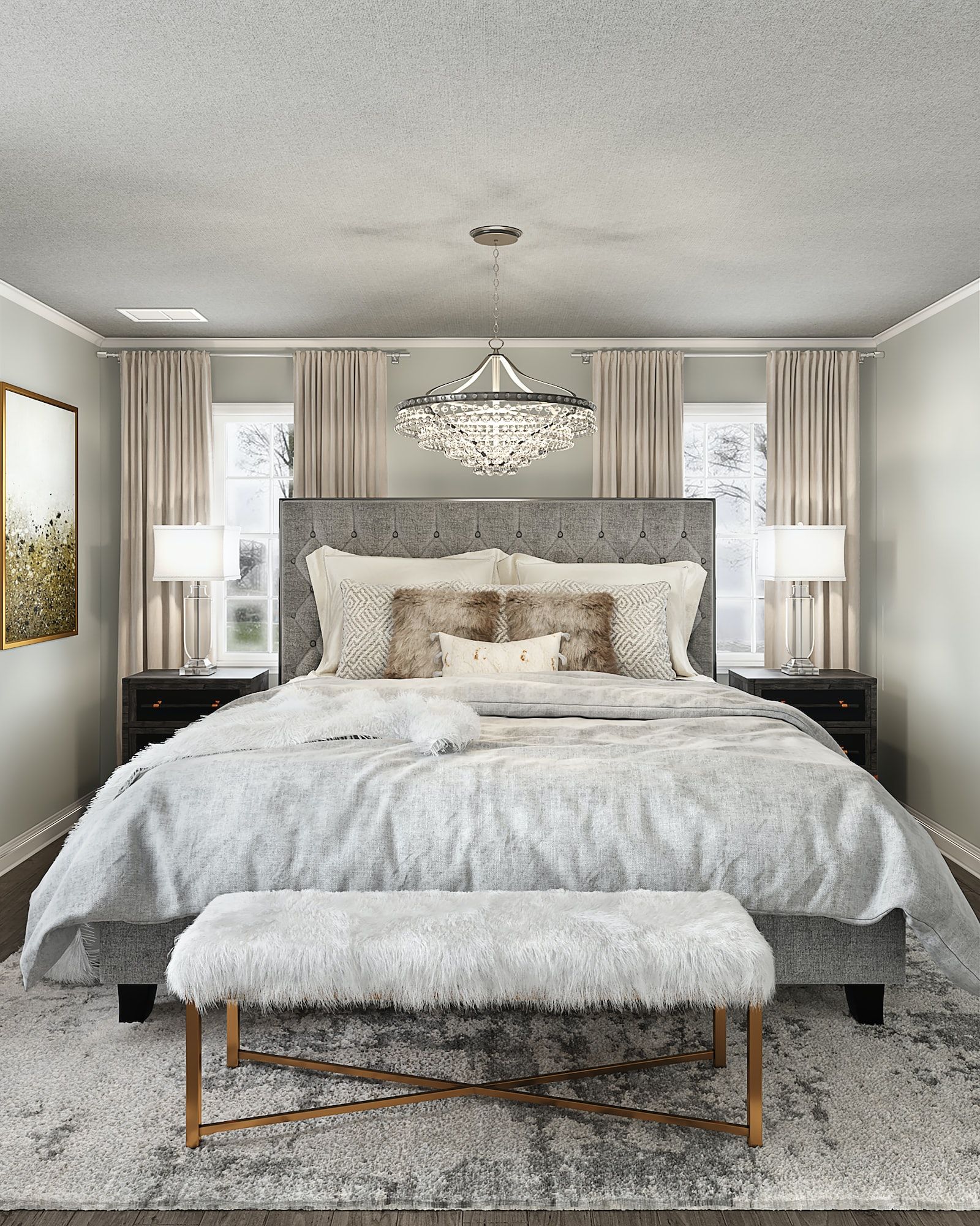 Nel glam, più è meglio è. Influenzato dal lusso della Hollywood degli anni '30, questo stile è l'opposto del minimalismo. C'è molto sfarzo e stratificazione di tessuti lussuosi. Pelliccia sintetica, velluto e peluche con accenti drammatici e audaci come oro, cromo e specchi sono i punti fermi del design glam.