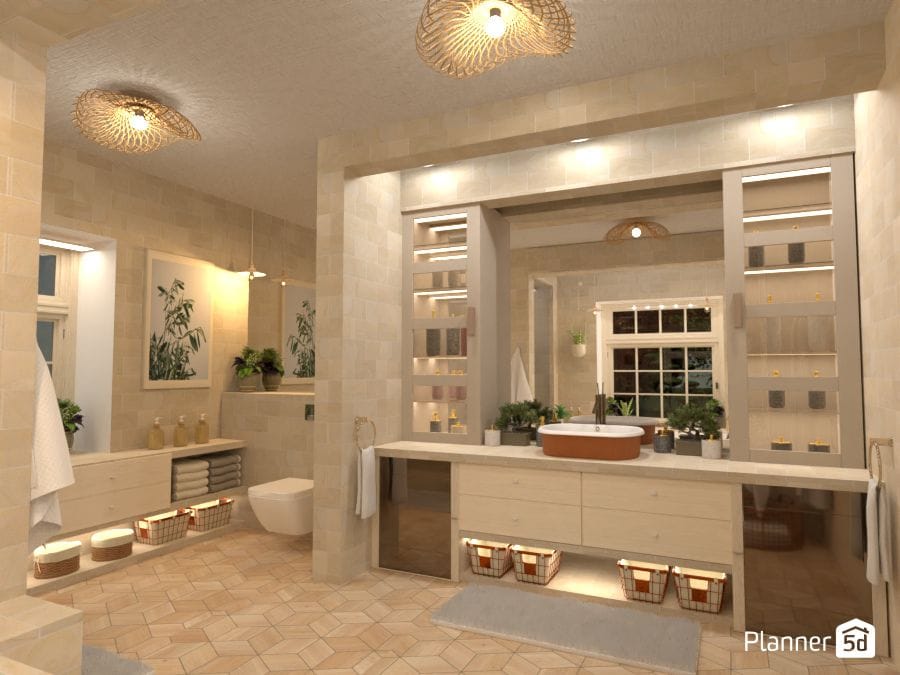 Banheiro 3D e planta baixa projetada no Planner 5D.