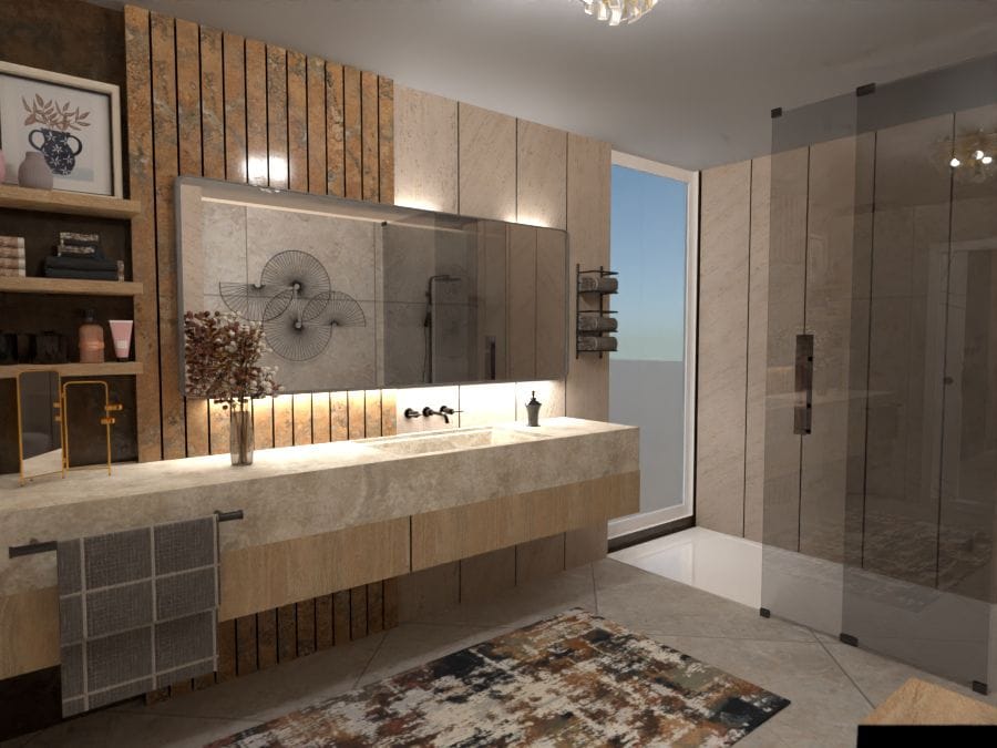 Um banheiro grande permite explorar soluções mais sofisticadas e criativas. Com mais espaço, você pode investir em uma cuba dupla, bancada extensa, armários planejados, banheira, entre outros.