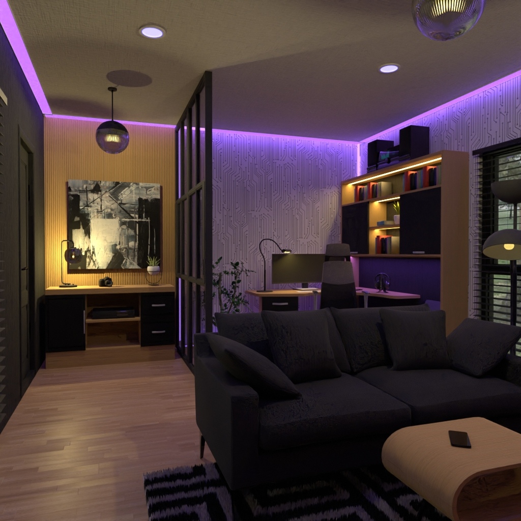 Design a modern interior with smart tech and mood lighting.