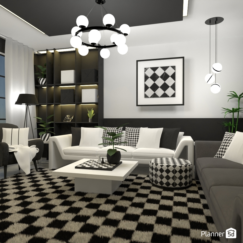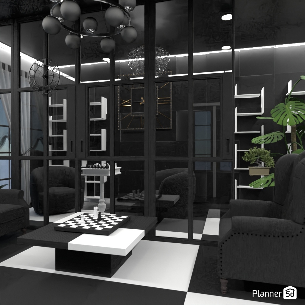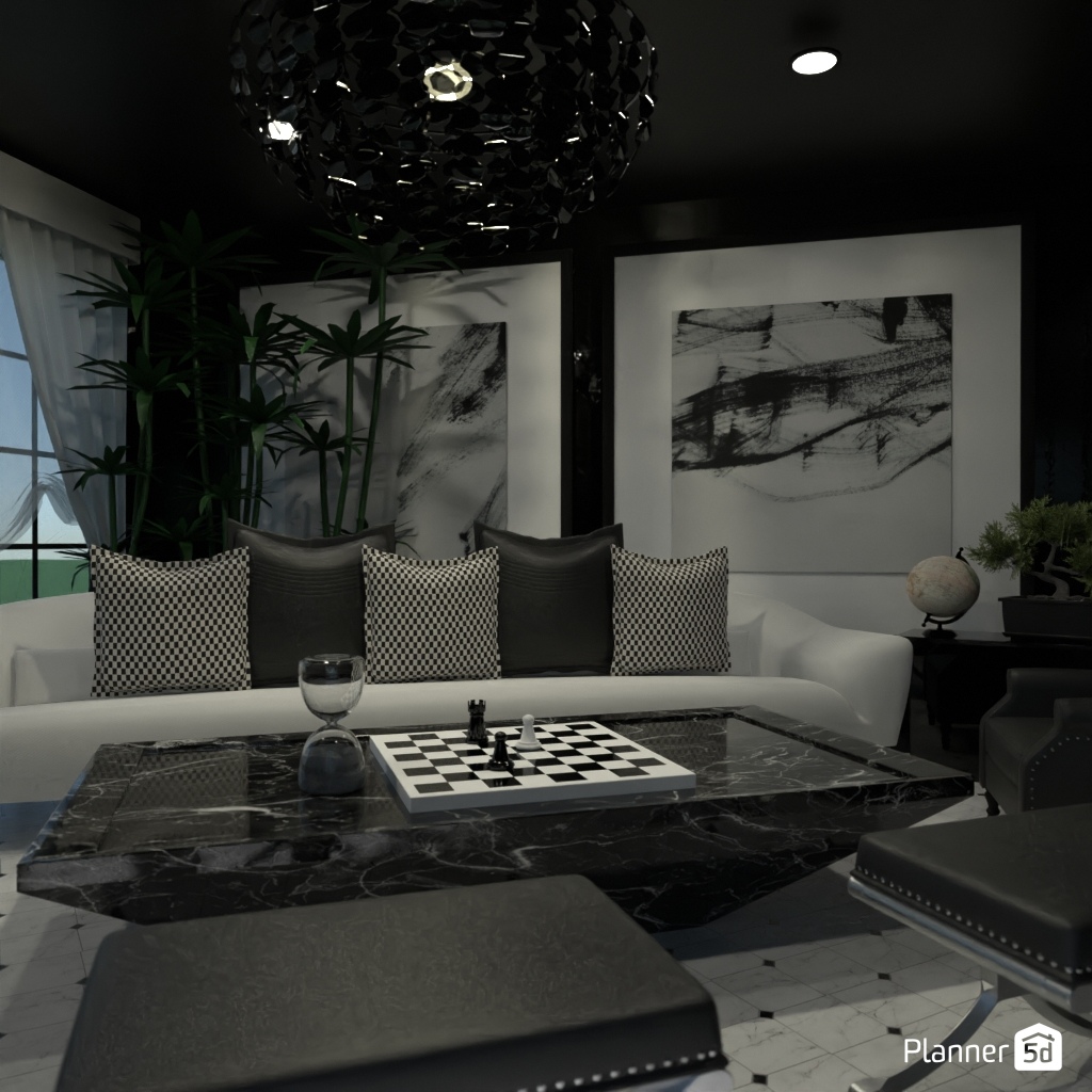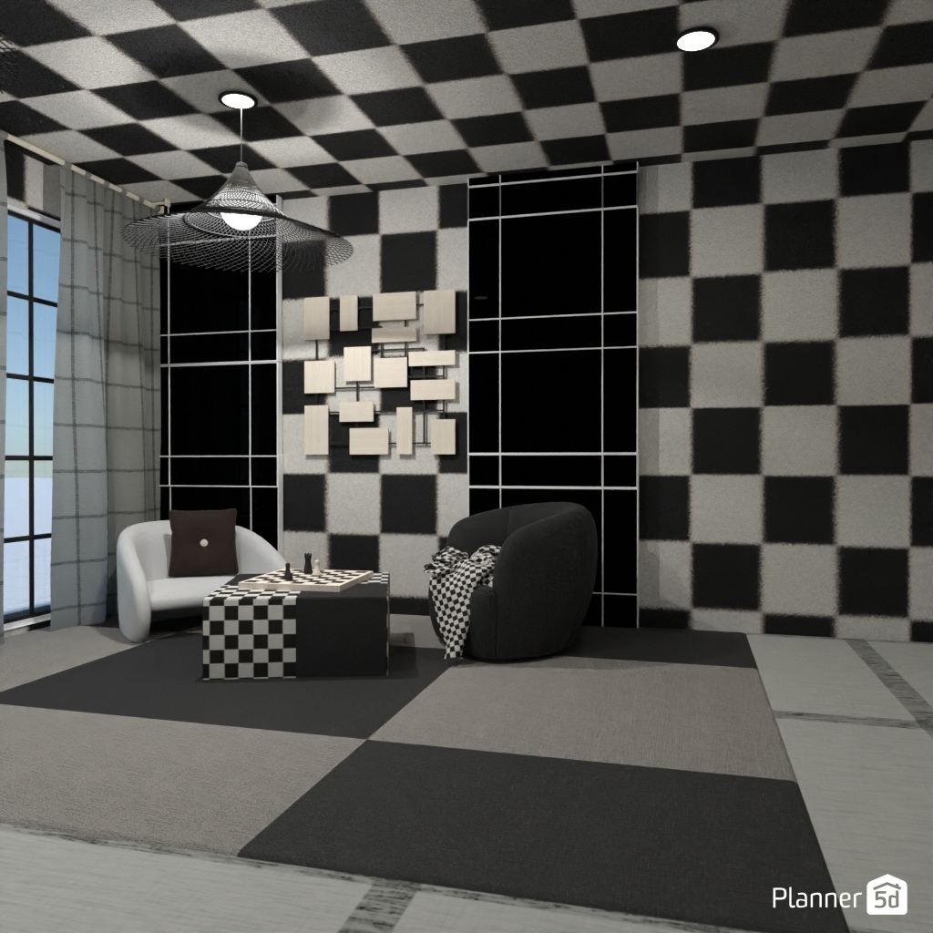 Design a sophisticated chess-themed interior using black-and-white contrasts and elegant details.