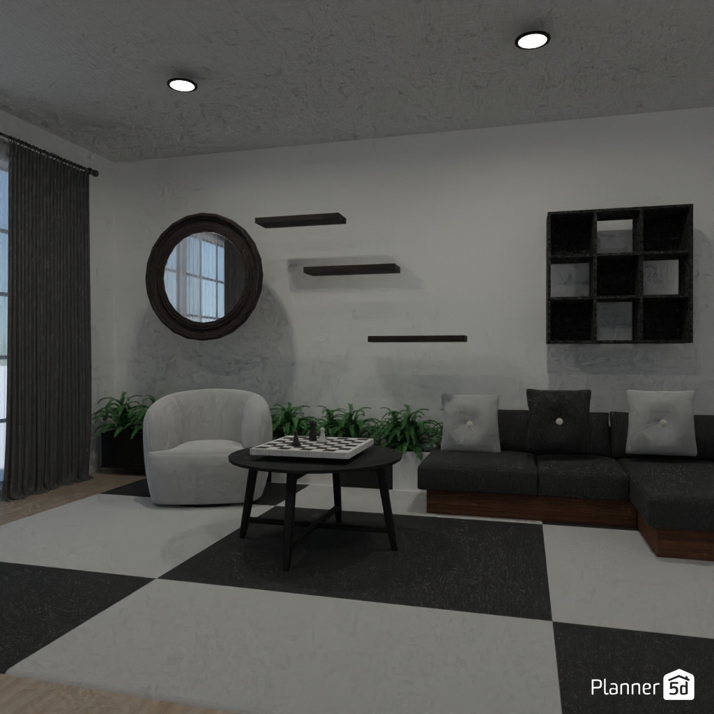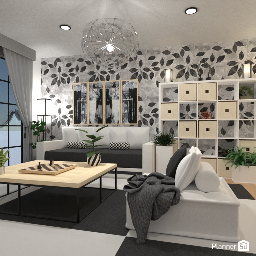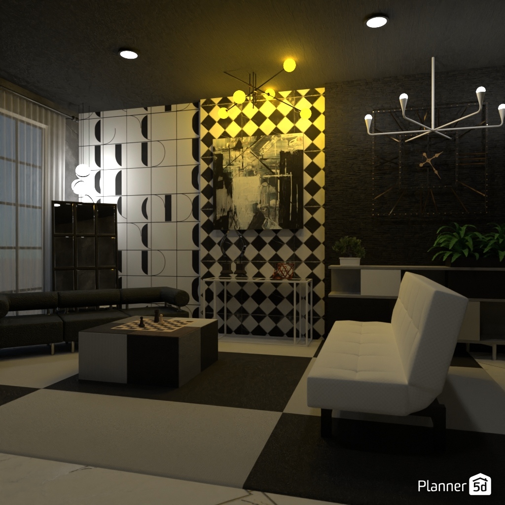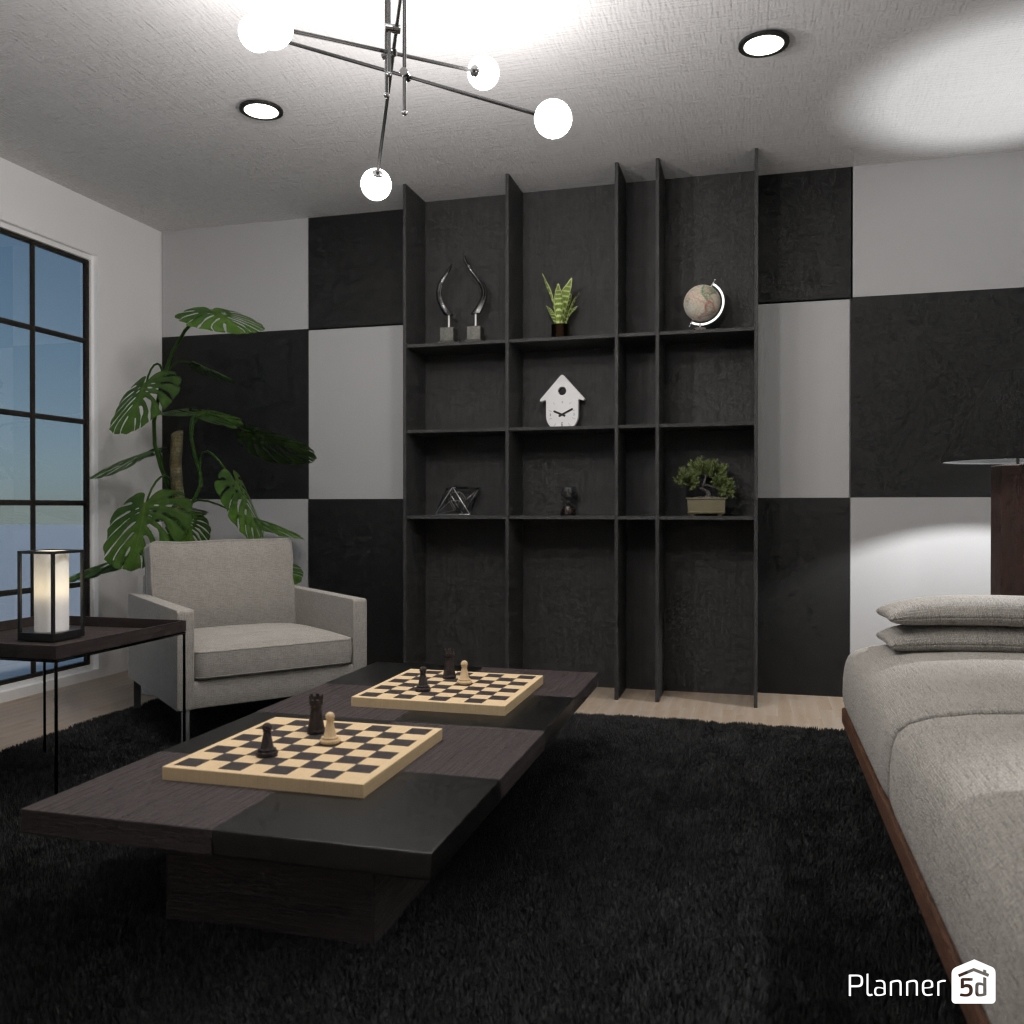 Design a sophisticated chess-themed interior using black-and-white contrasts and elegant details.