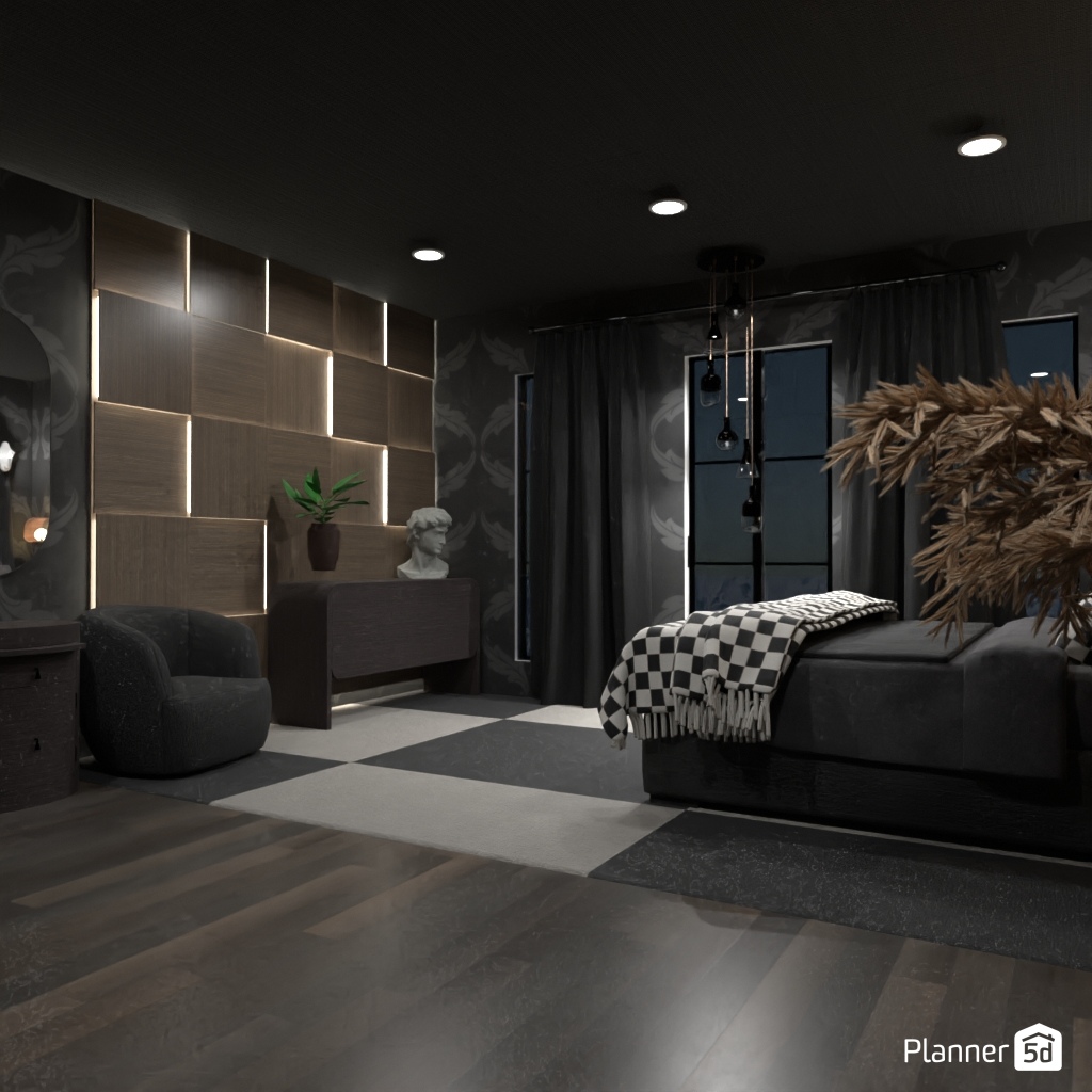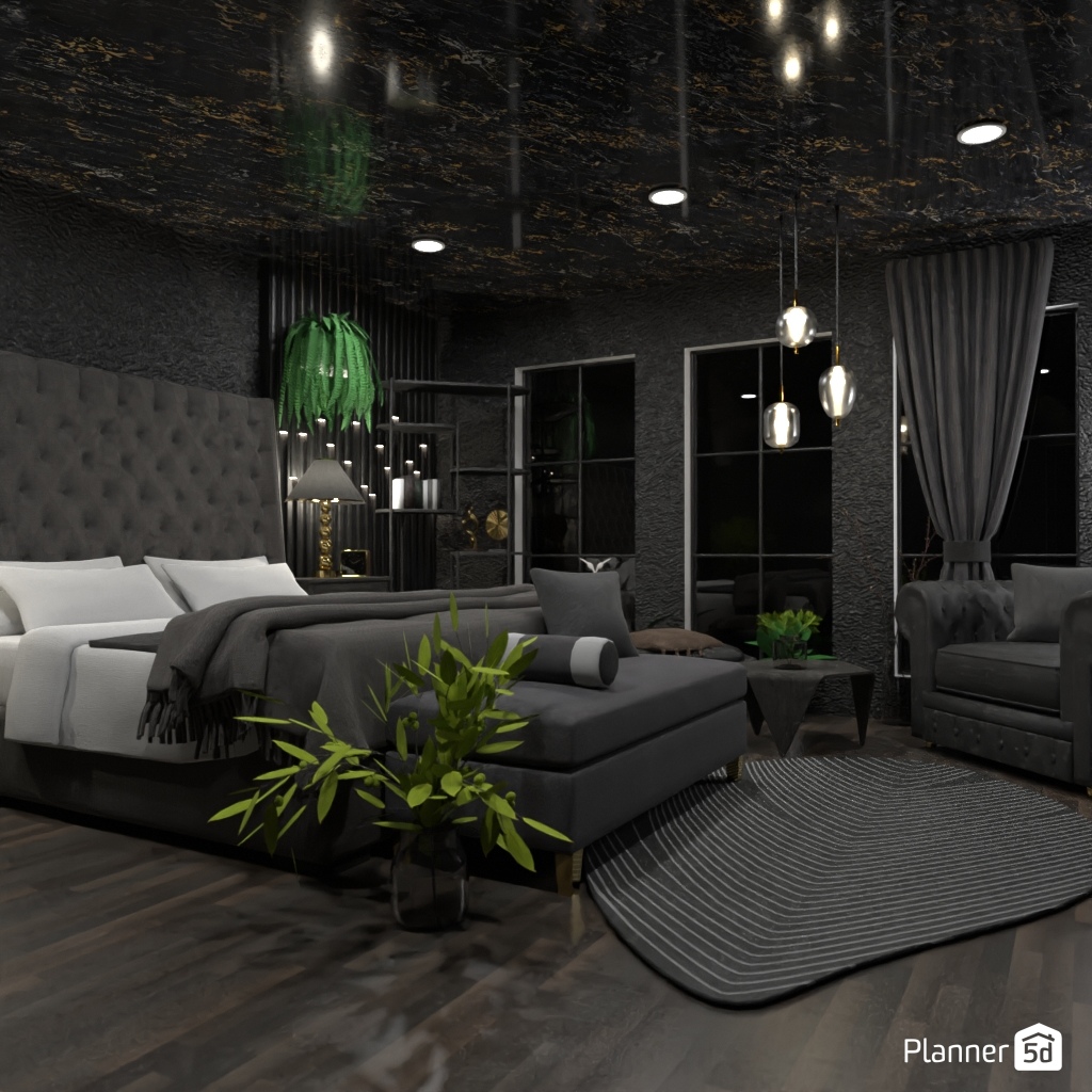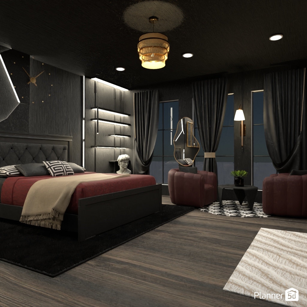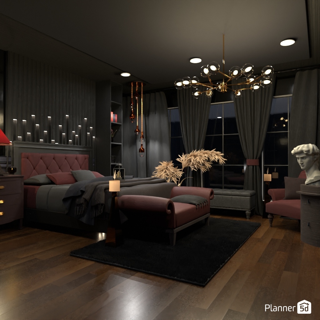 Design a dark and dramatic room using deep colors, mood lighting, and luxurious textures.