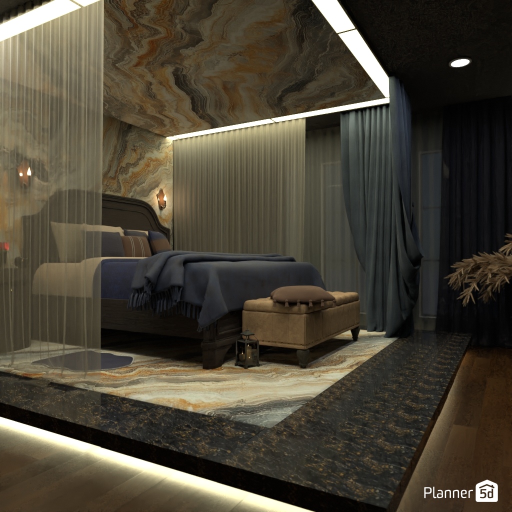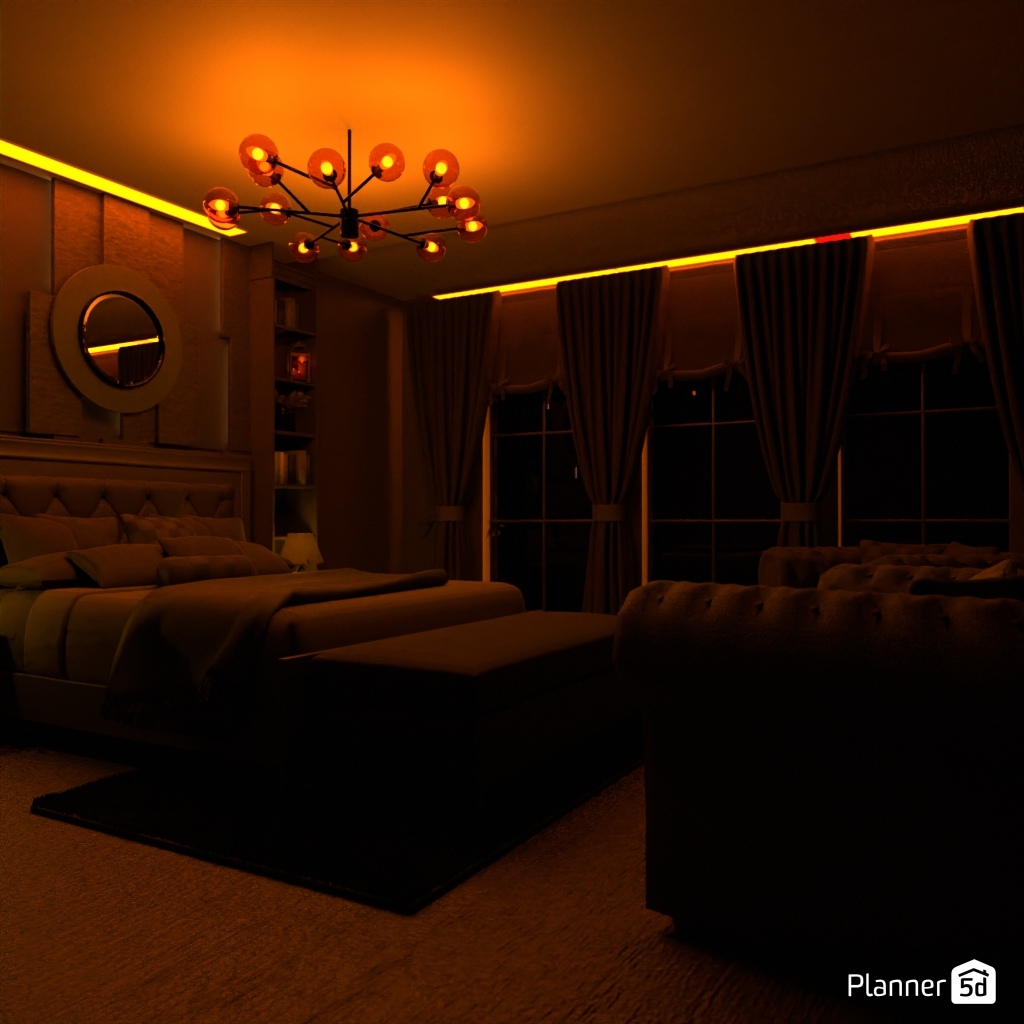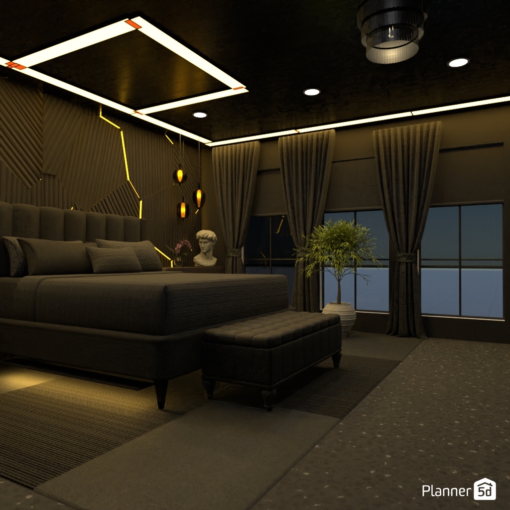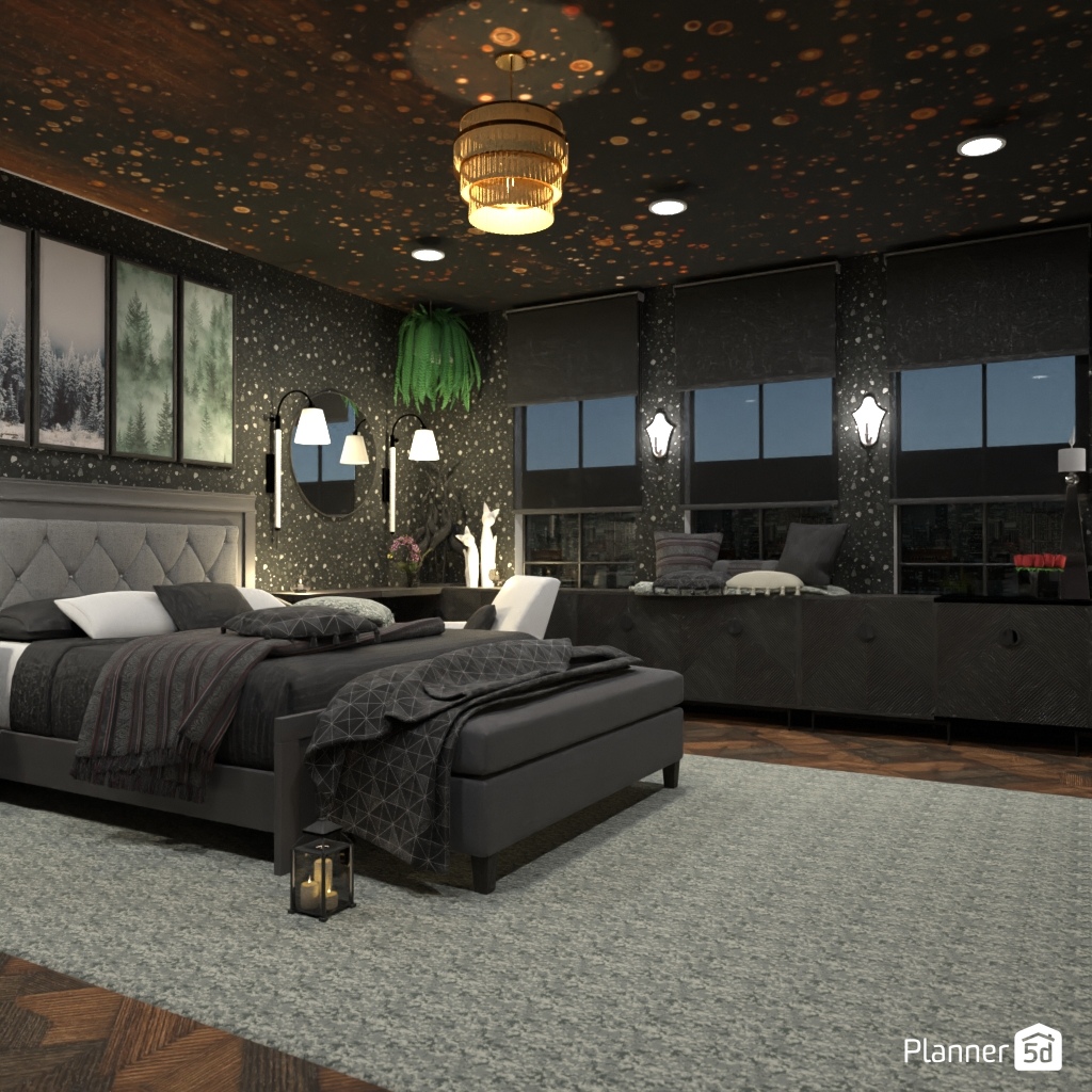 Design a dark and dramatic room using deep colors, mood lighting, and luxurious textures.