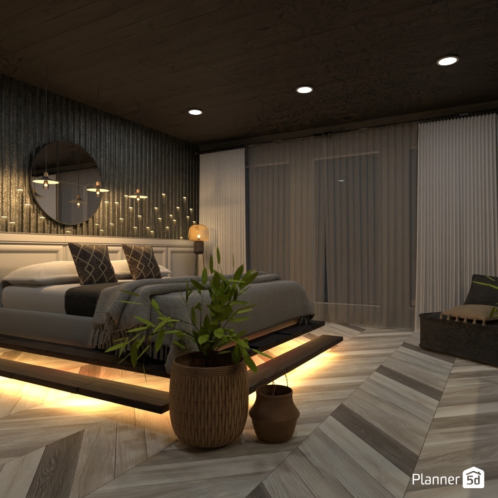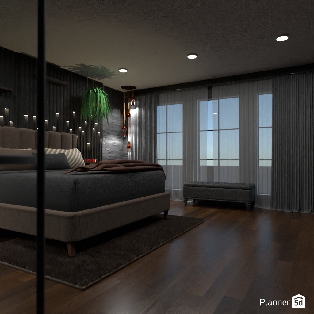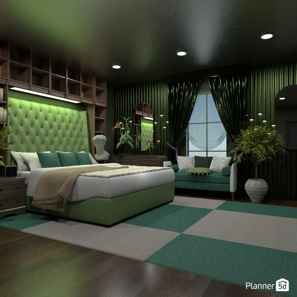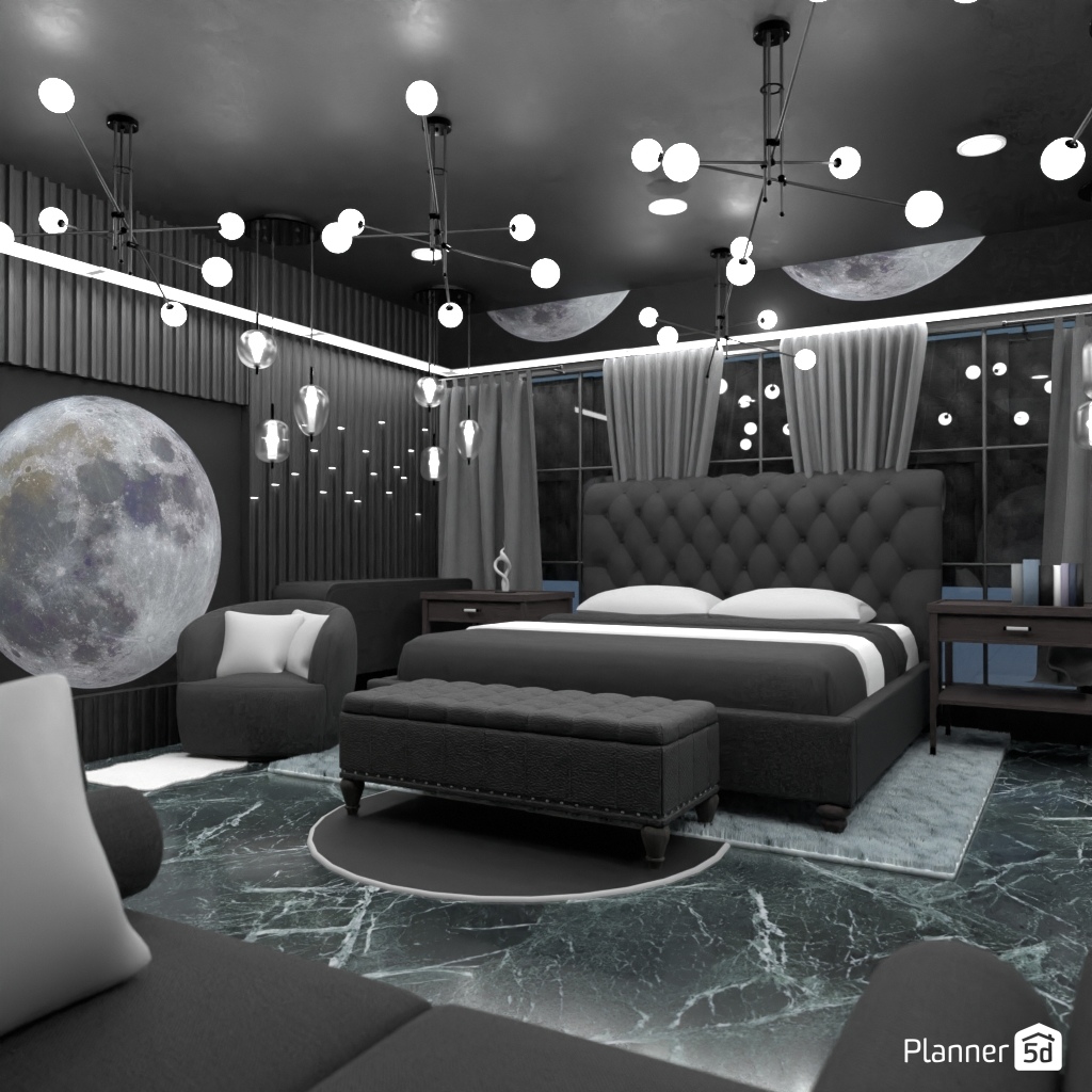 Design a dark and dramatic room using deep colors, mood lighting, and luxurious textures.