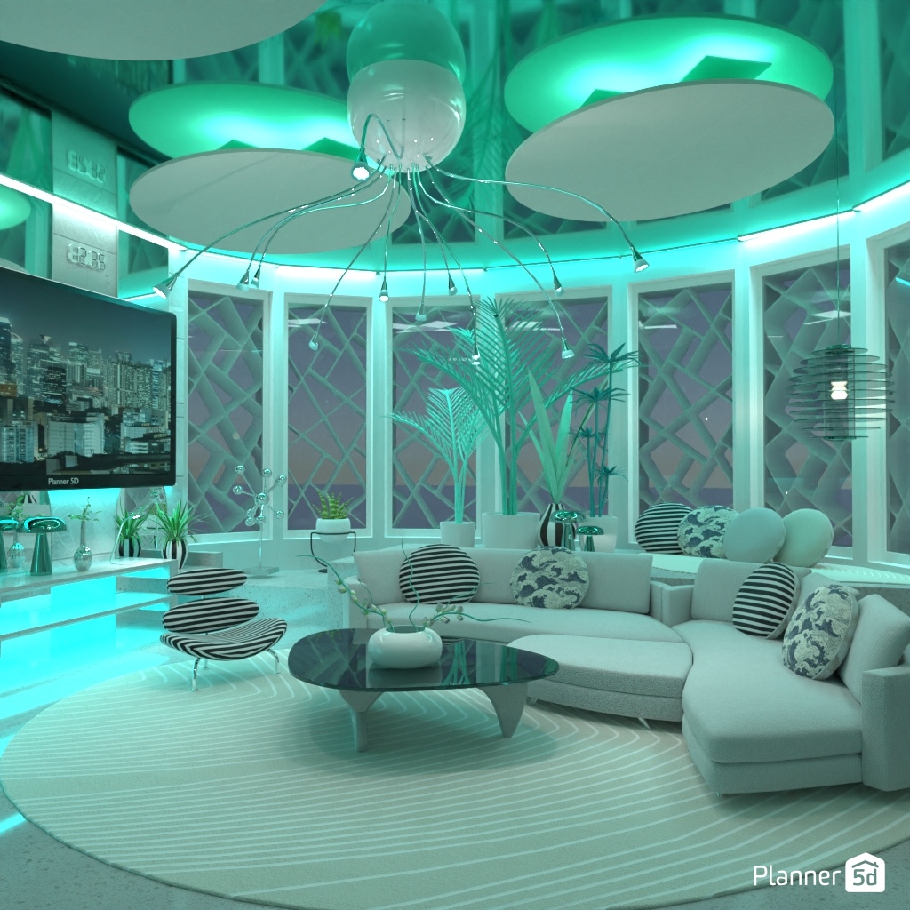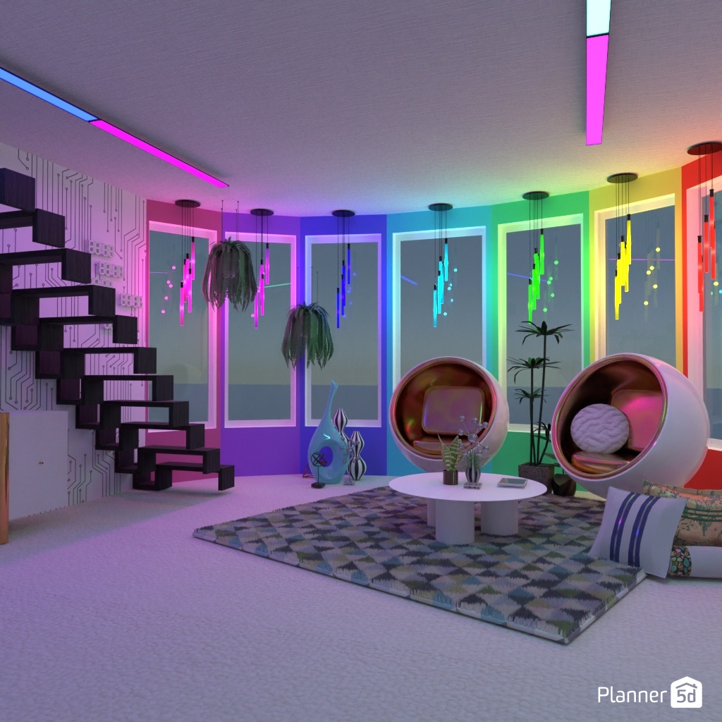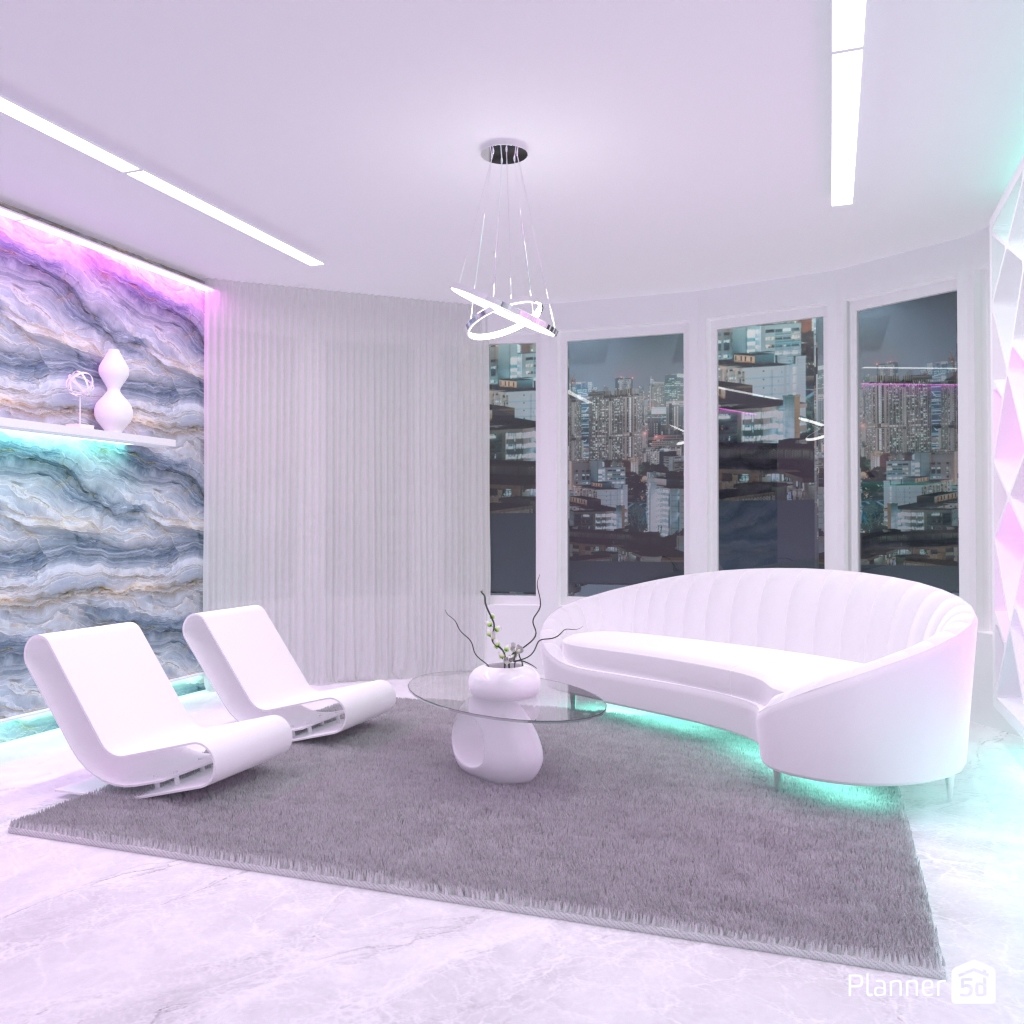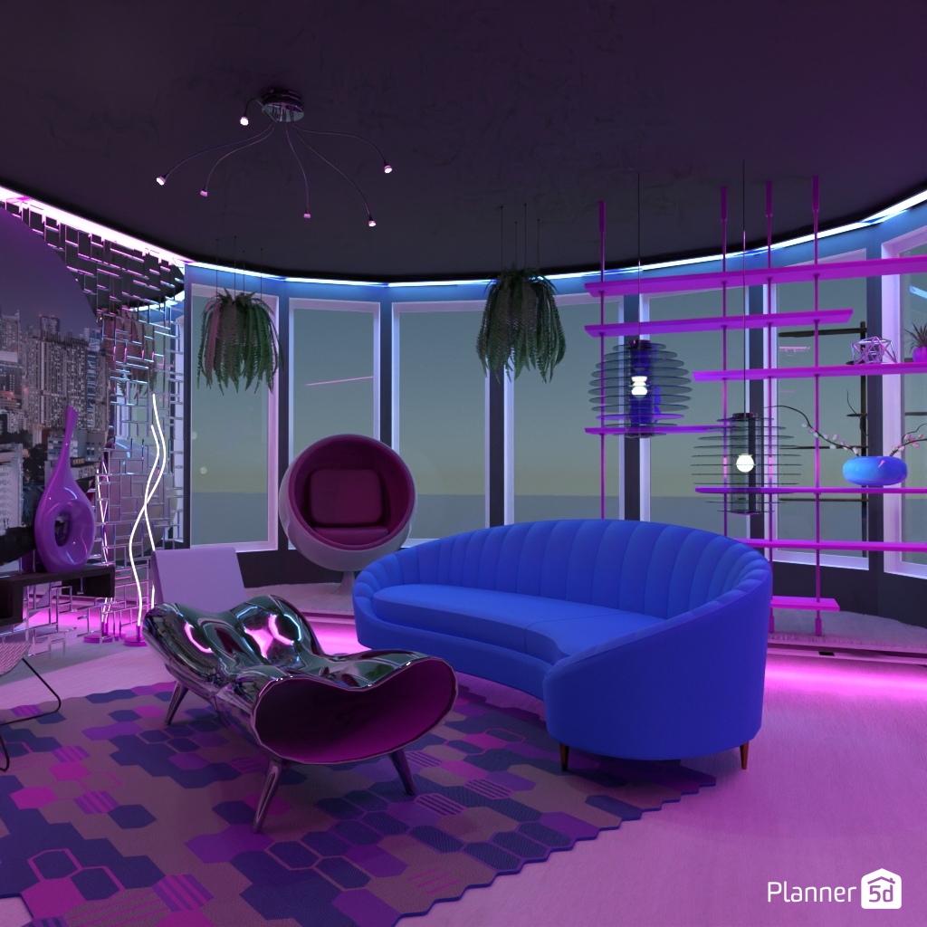 Design a futuristic living room: neon lighting, shaped furniture.