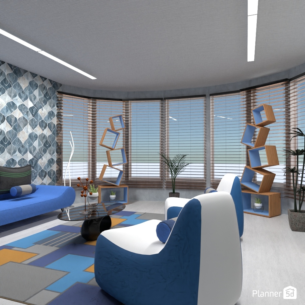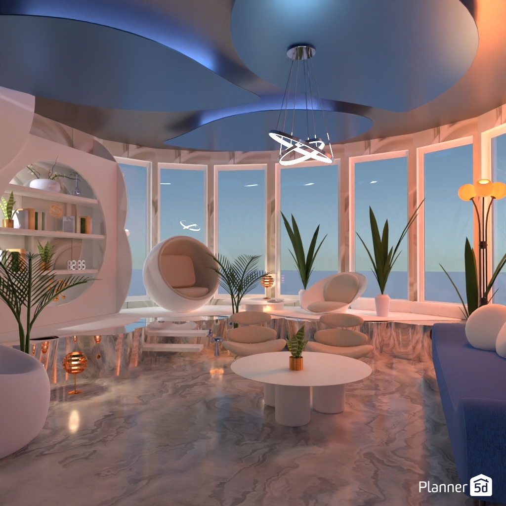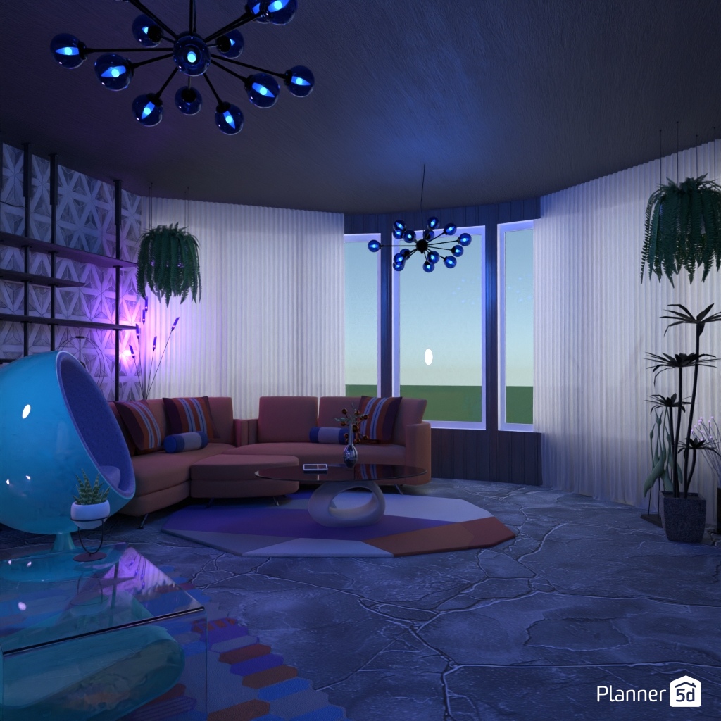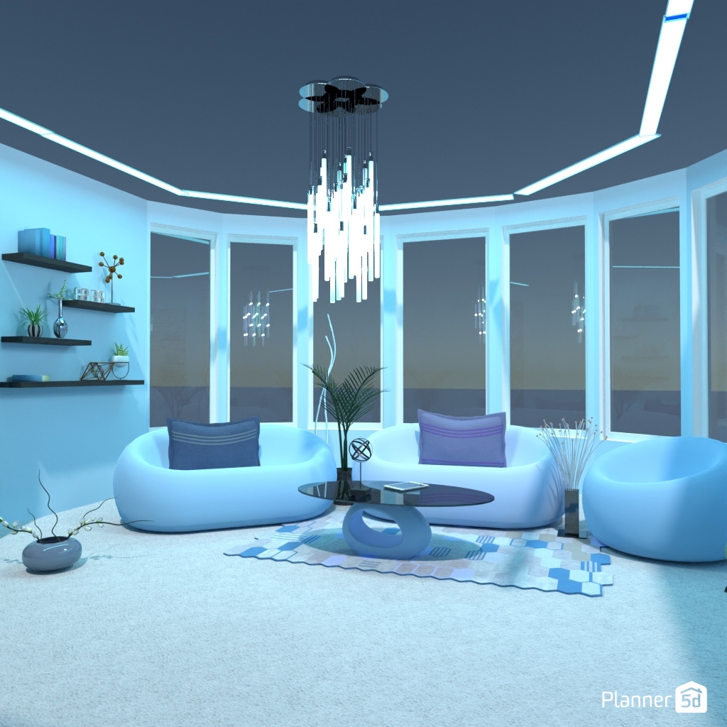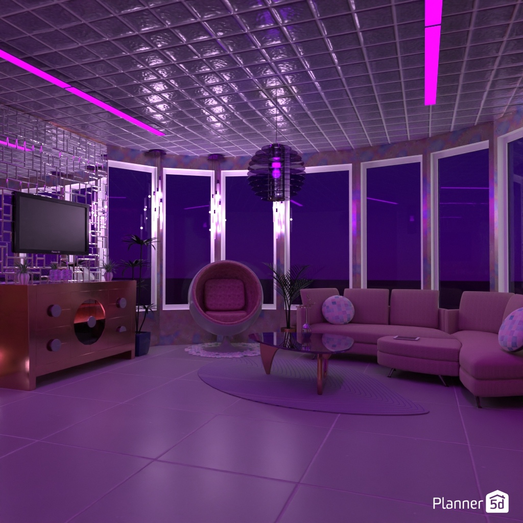 Design a futuristic living room: neon lighting, shaped furniture.