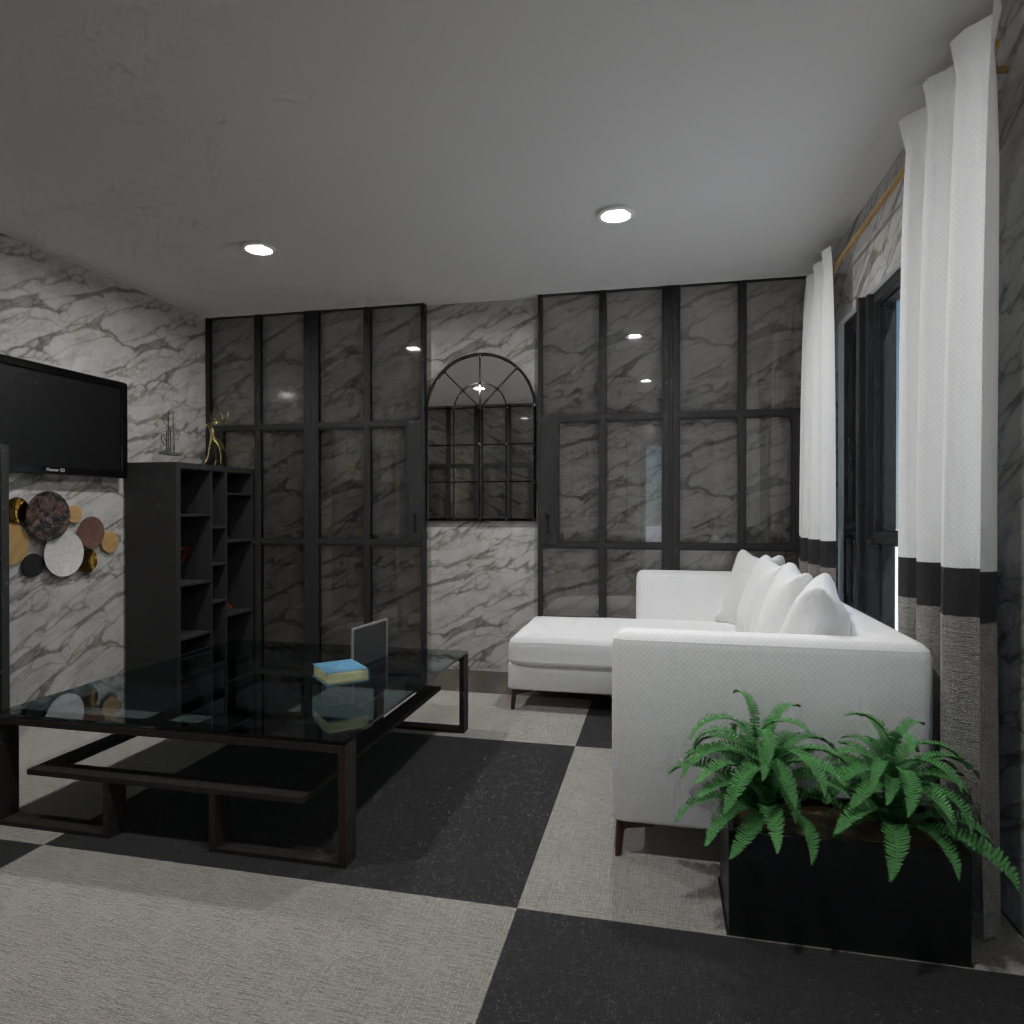 Design a living room interior with different geometric shapes.