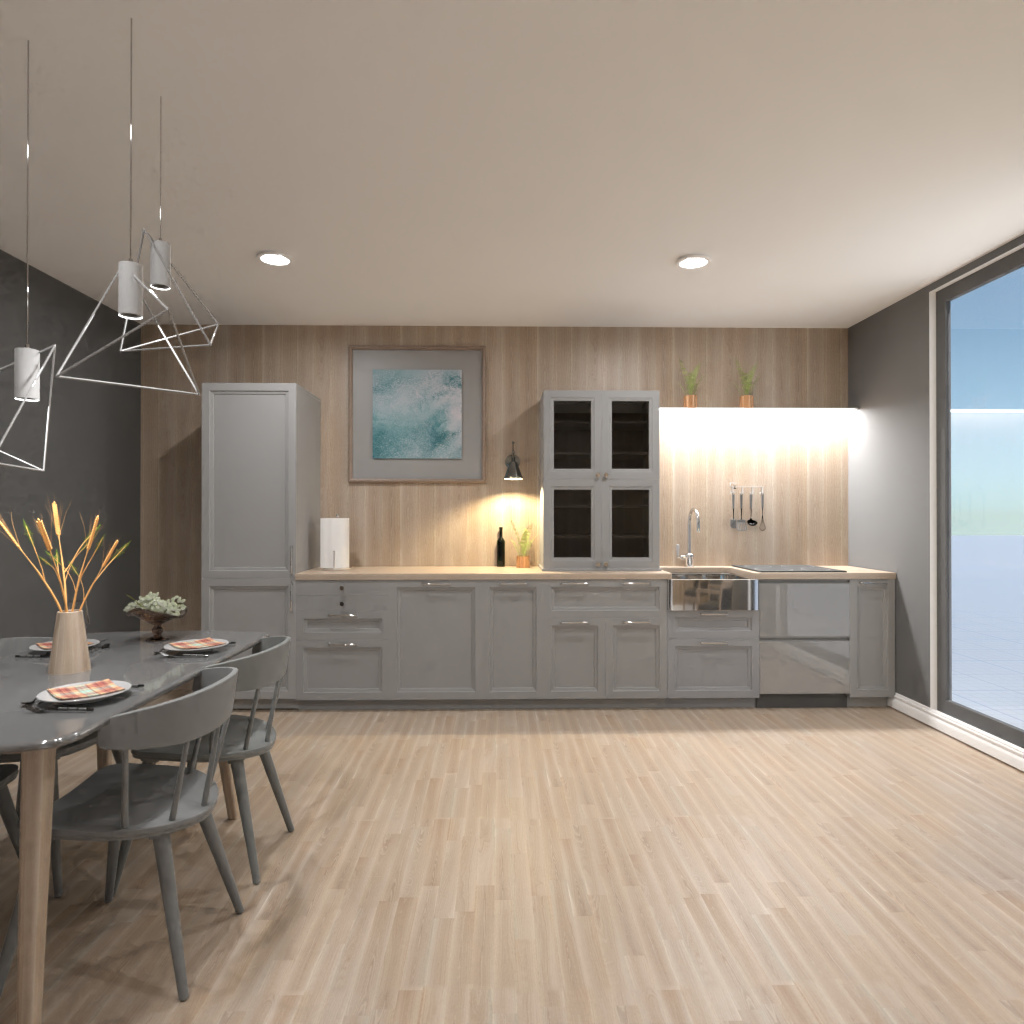 Design a kitchen interior in white and brown colors.