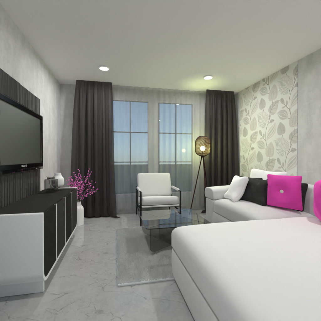 Design the living room interior in black and white colors, with any one bright accent.