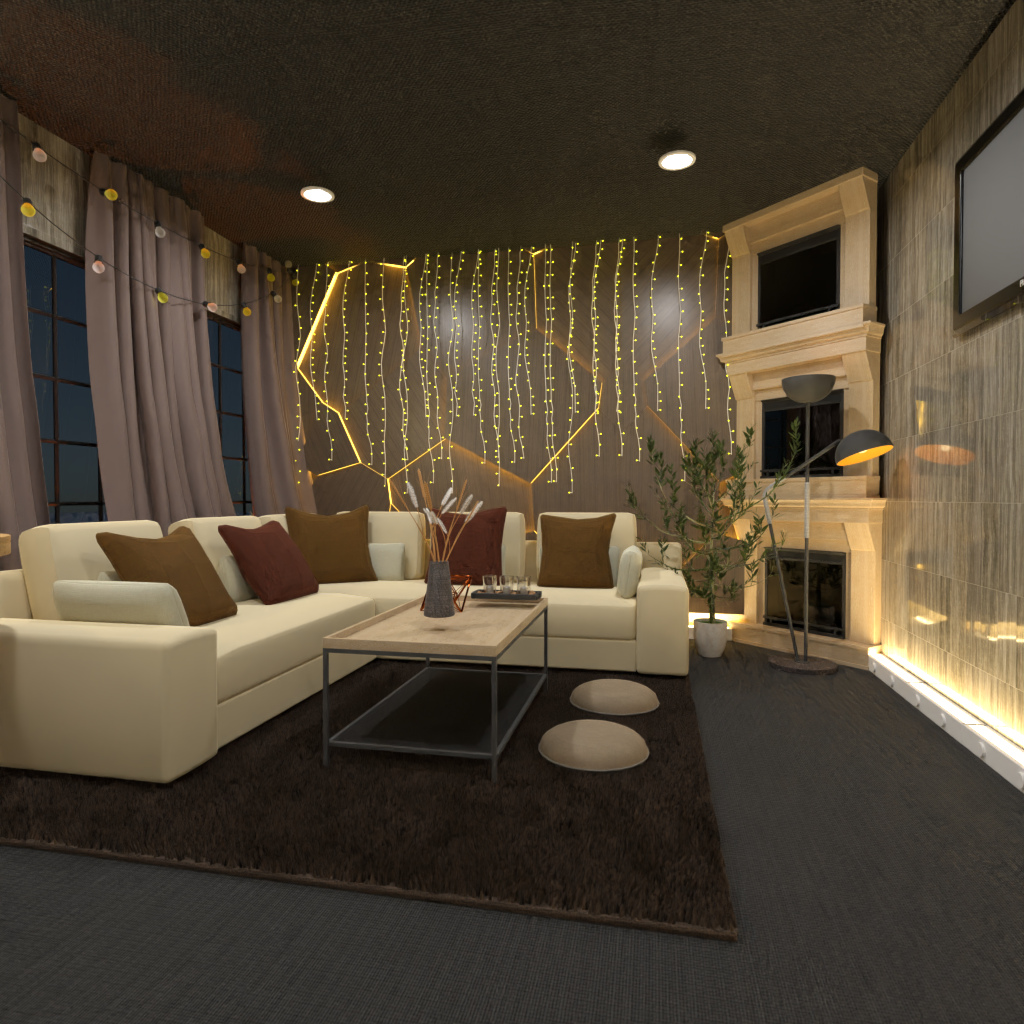 Design a cozy living room interior with a fireplace and lots of pillows.