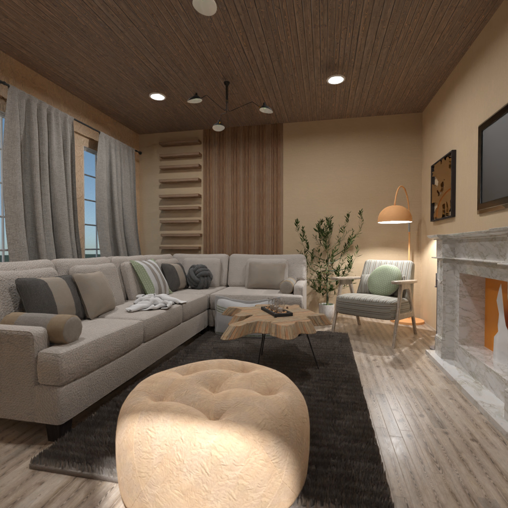 Design a cozy living room interior with a fireplace and lots of pillows.