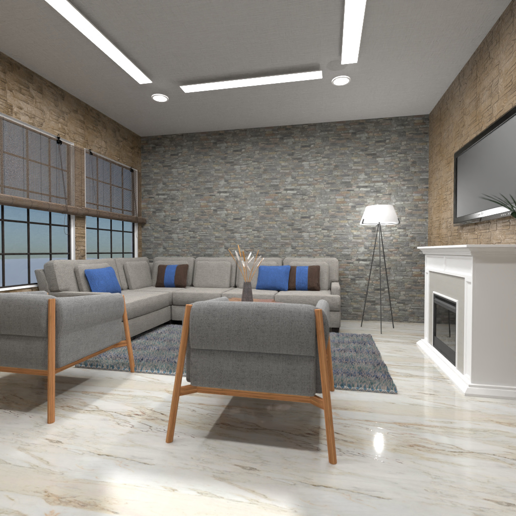 Design a cozy living room interior with a fireplace and lots of pillows.