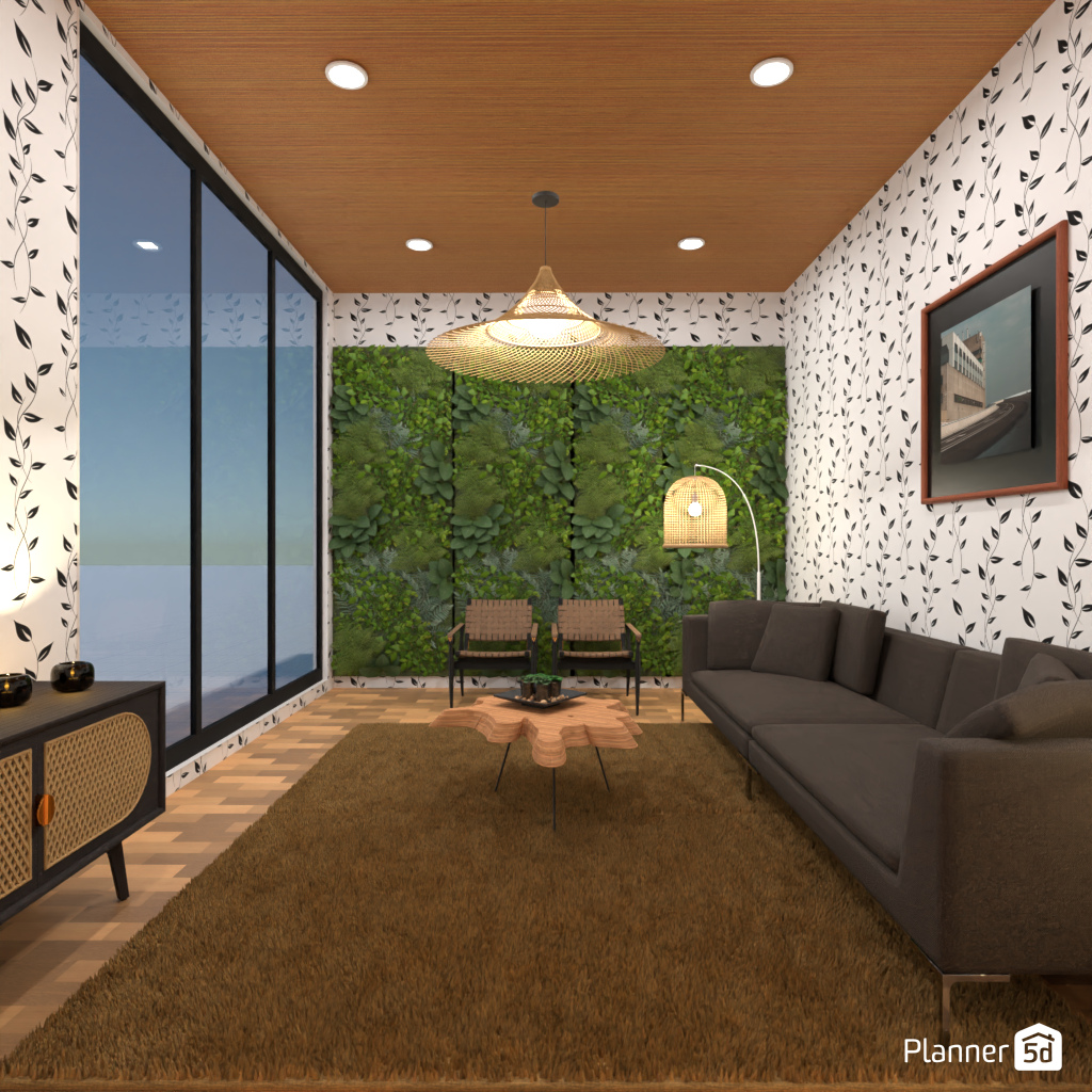 Design a living room interior in natural textures and colors.