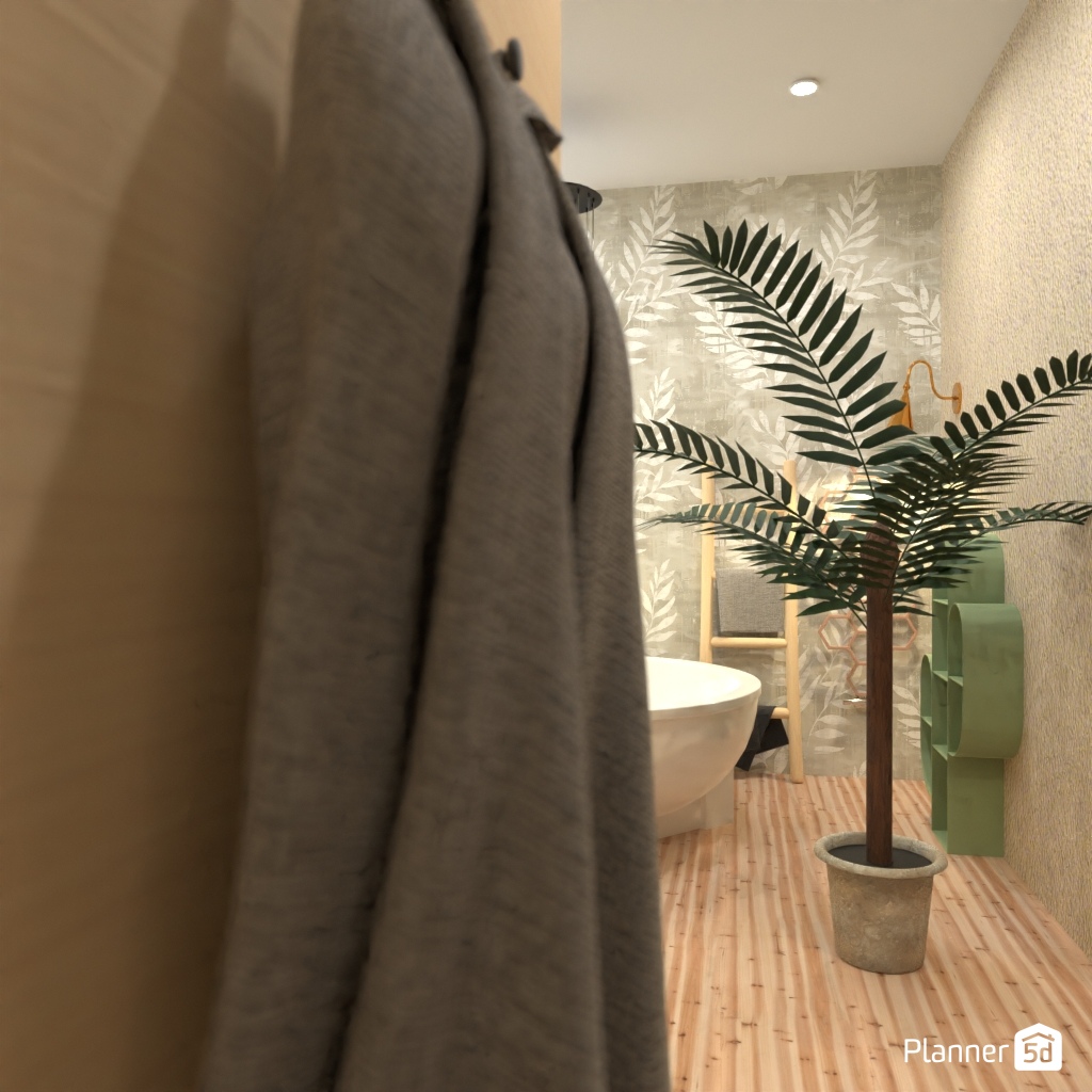 Create a bathroom while using natural materials, like wood, stone, plants.