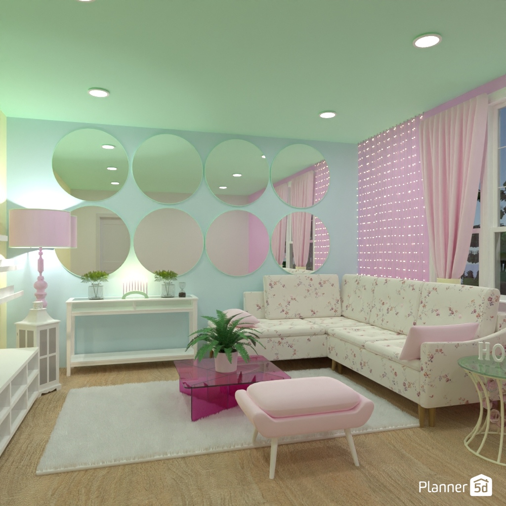 Design the living room interior with pastel colors.