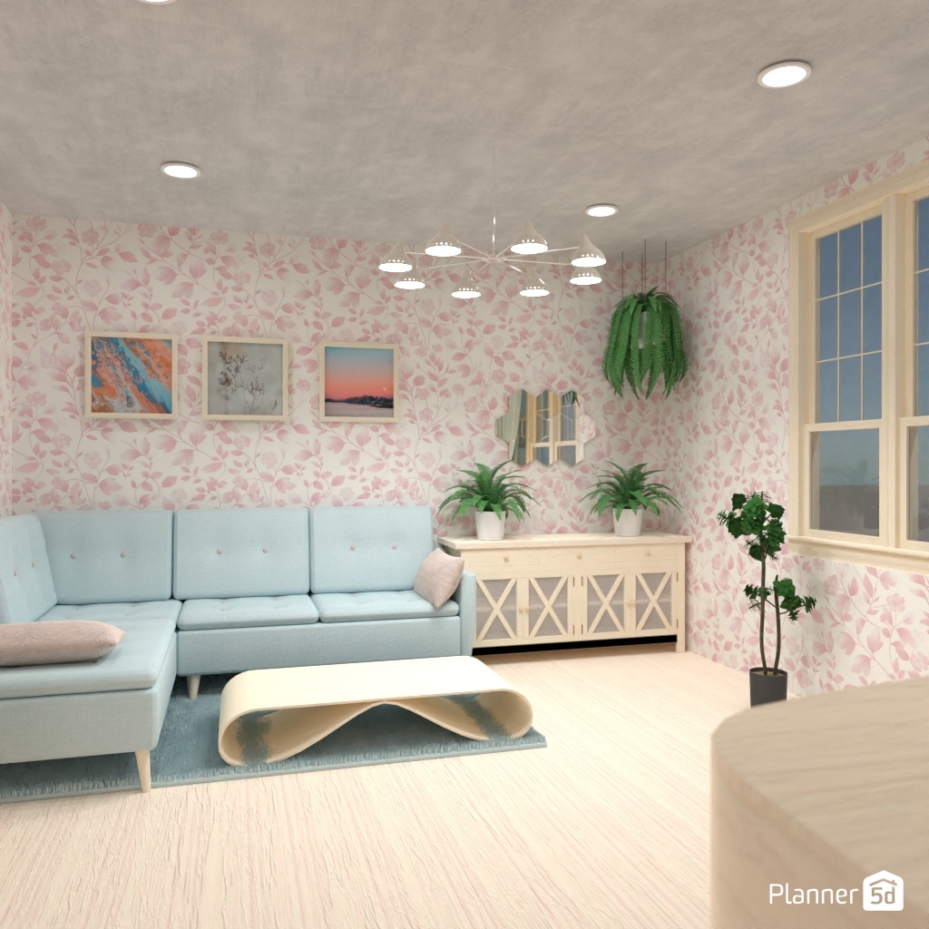 Design the living room interior with pastel colors.