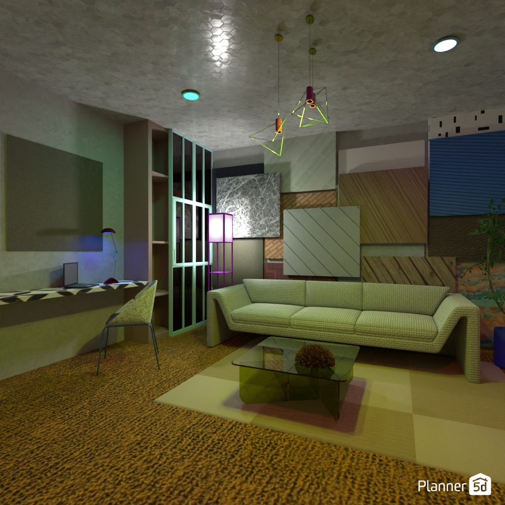 Paint a living room interior with different geometric shapes.