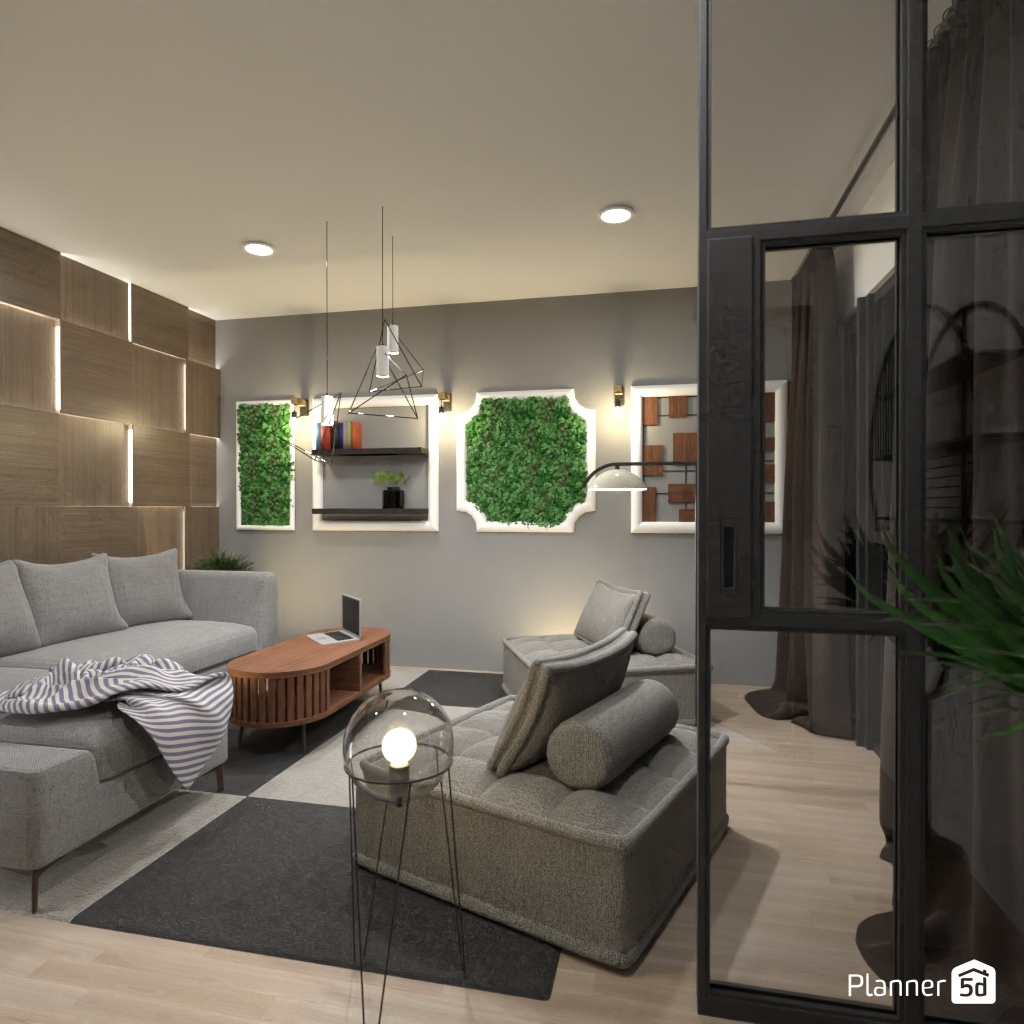 Design a living room interior with different geometric shapes.