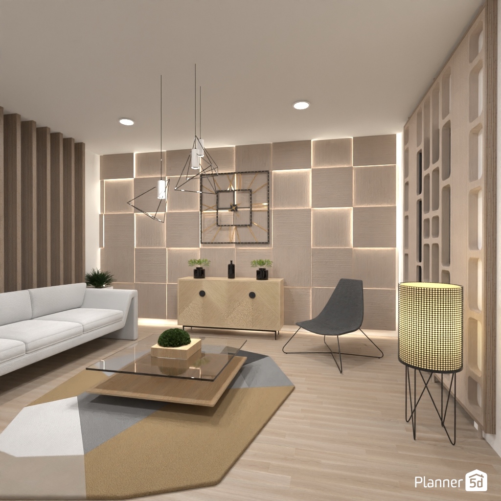 Design a living room interior with different geometric shapes.