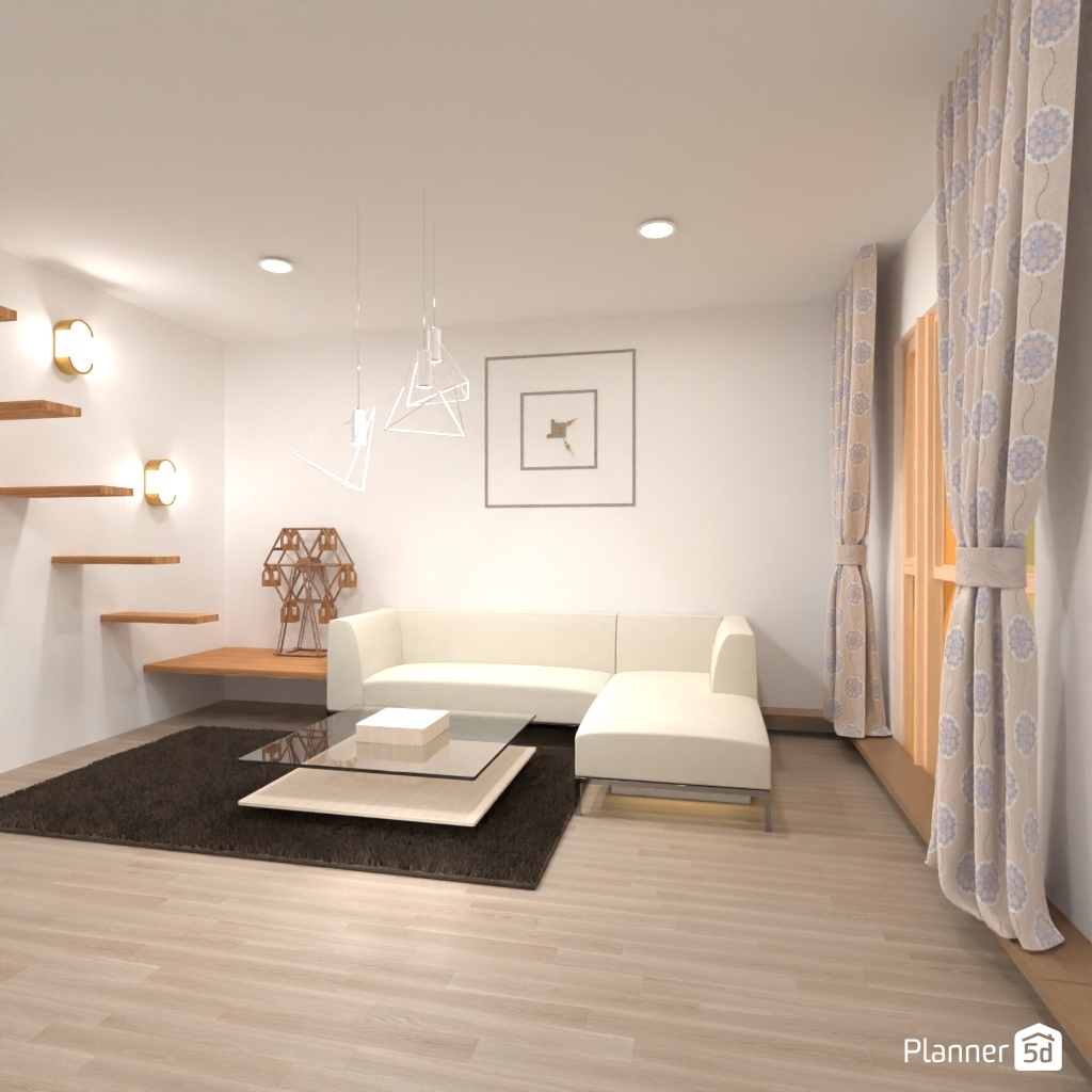 Design a living room interior with different geometric shapes.
