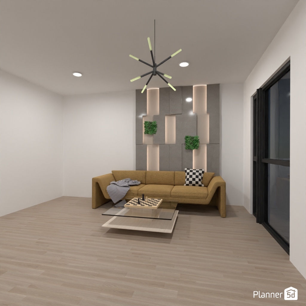 Design a living room interior with different geometric shapes.