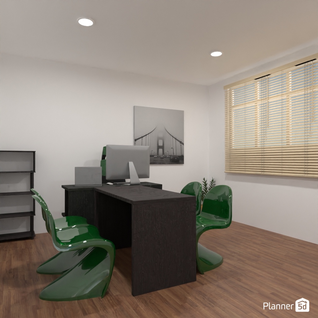 Create a room interior using three colors: red, blue, and white.