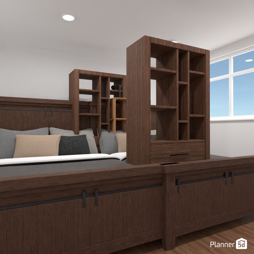 Create a room interior using three colors: red, blue, and white.