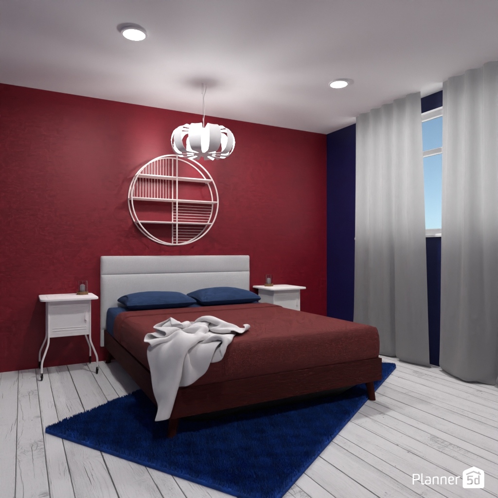 Create a room interior using three colors: red, blue, and white.