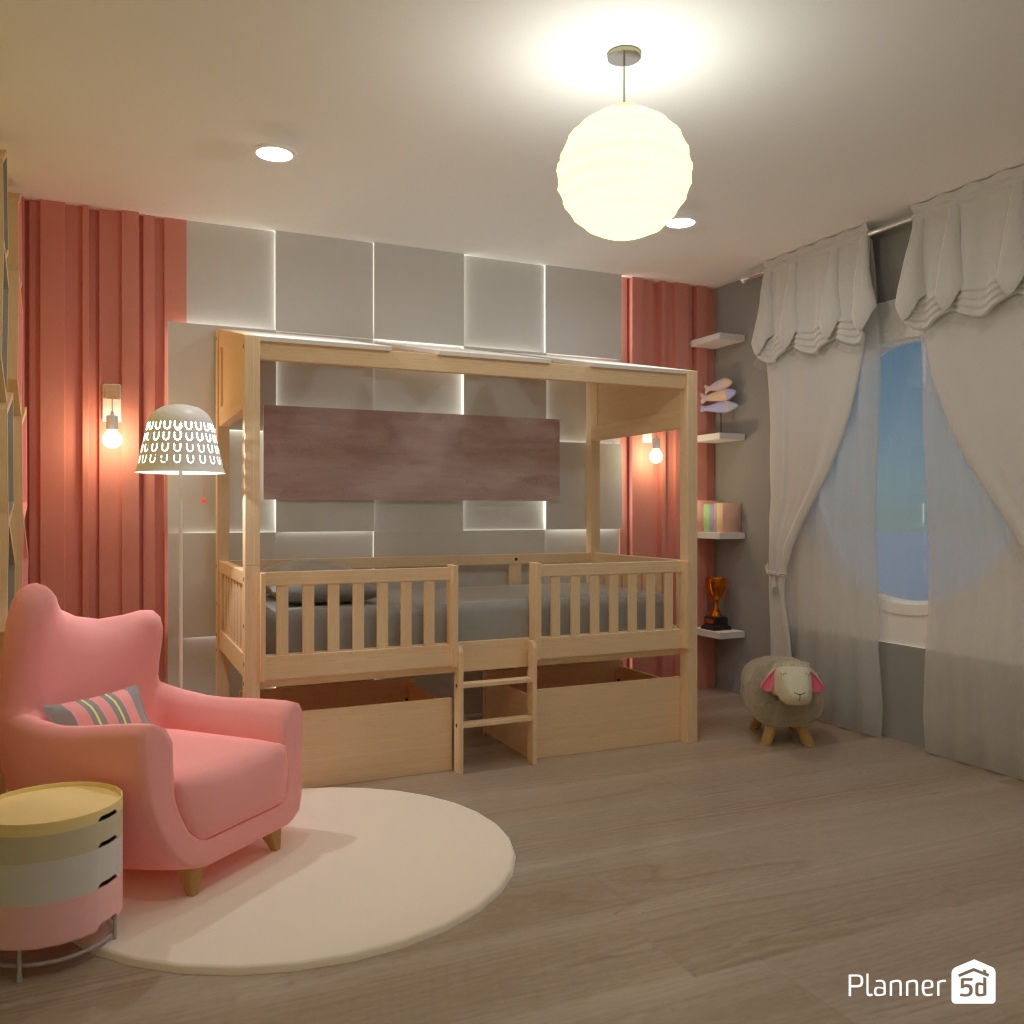 Design a kids bedroom interior in pastel colors.