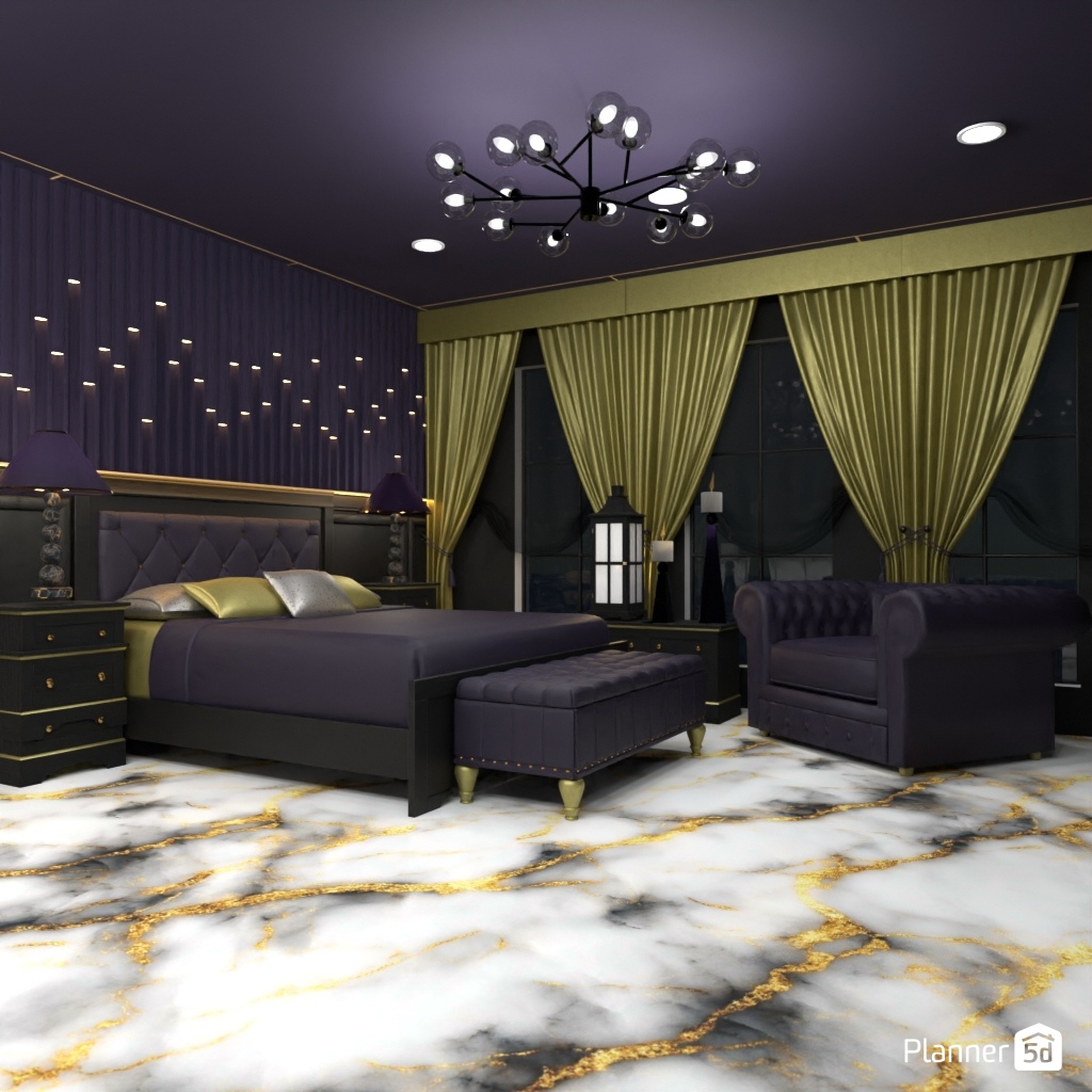 Design a dark and dramatic room using deep colors, mood lighting, and luxurious textures.