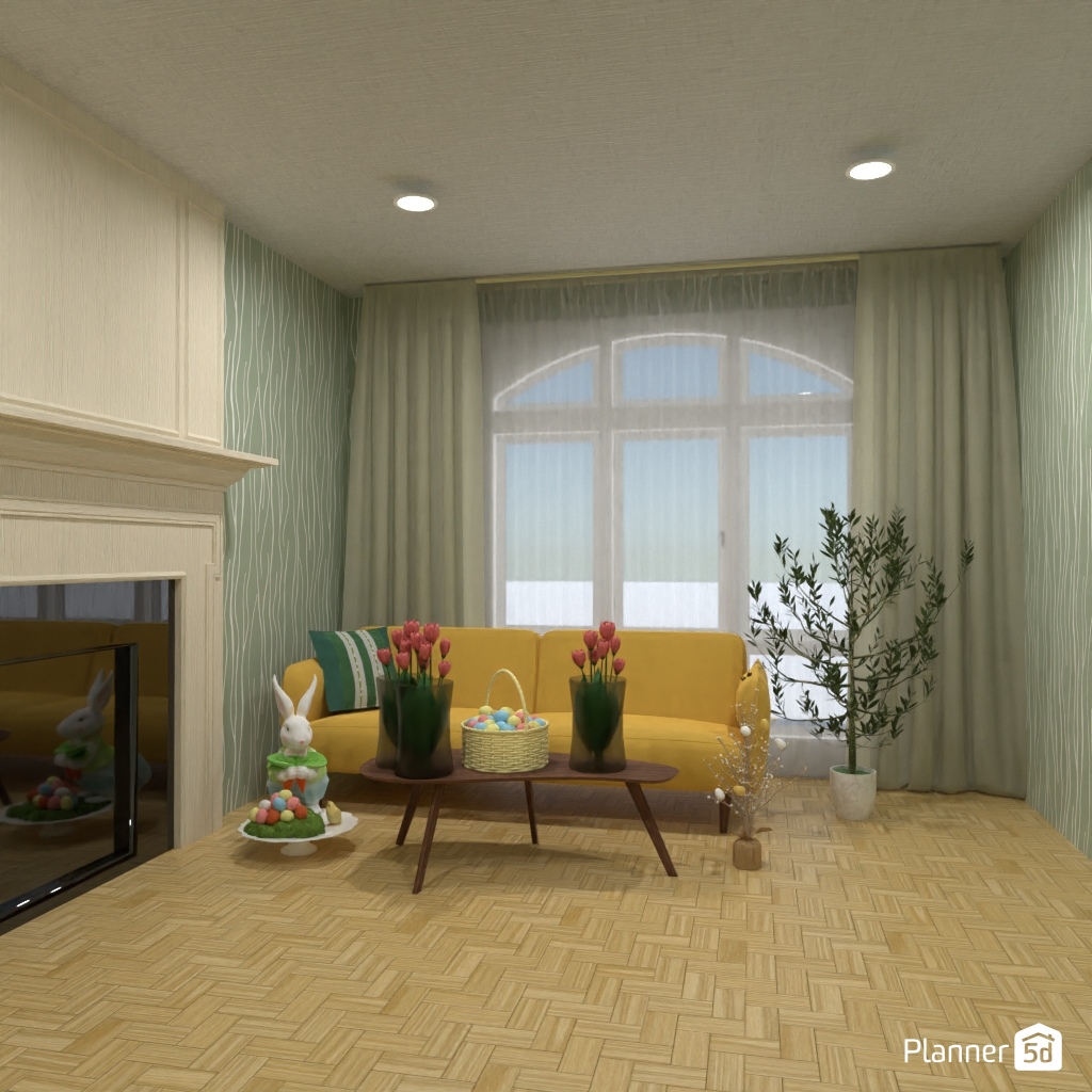 Design a light living room interior with green-yellow accents.