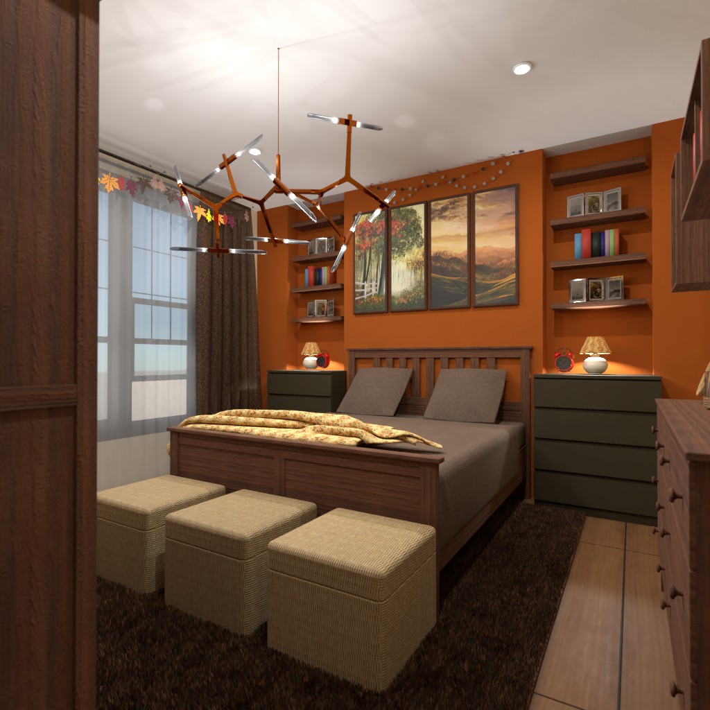 Design a bedroom in cozy style with orange or brown as accents color.