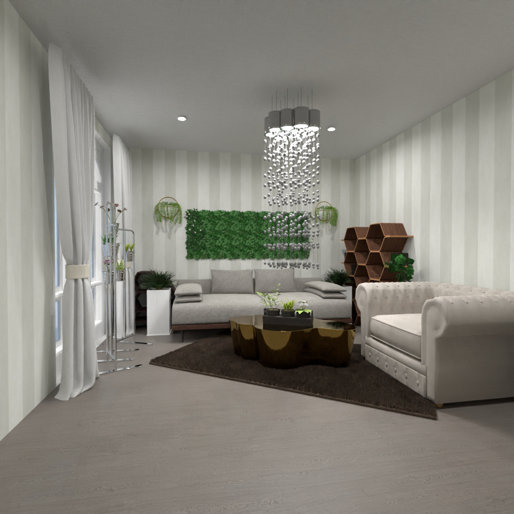 Gestalte ein Wohnzimmer mit Pflanzenwand.