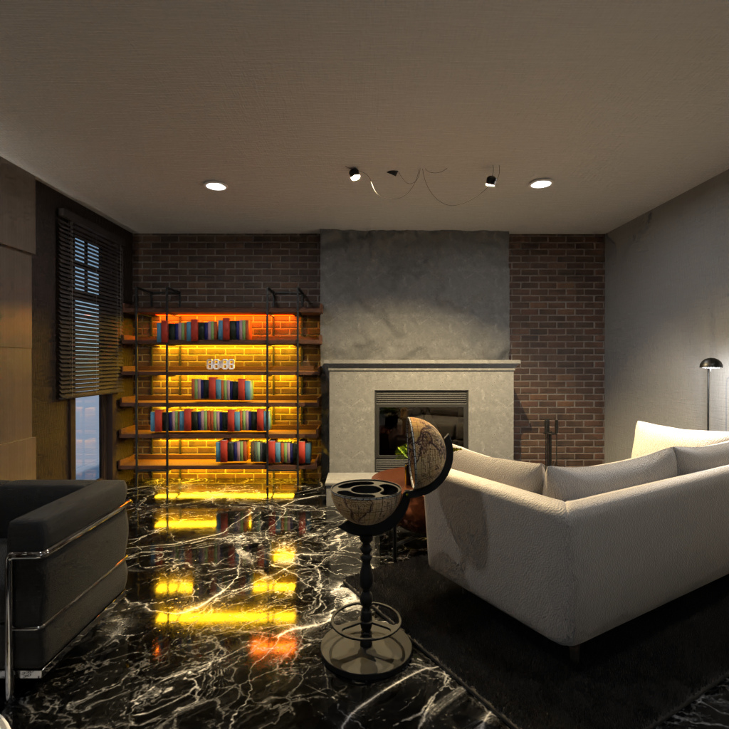 Design Sie ein Wohnzimmer mit diesen Materialien: Ziegel, Metall, Leder.