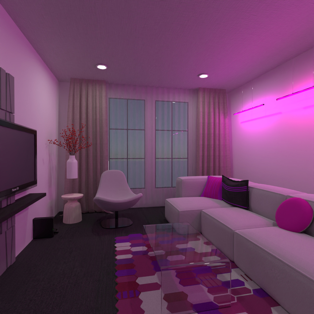 Design Sie das Wohnzimmerinterieur in Schwarz-Weiß-Farben mit einem lebhaften Akzent nach Wahl.